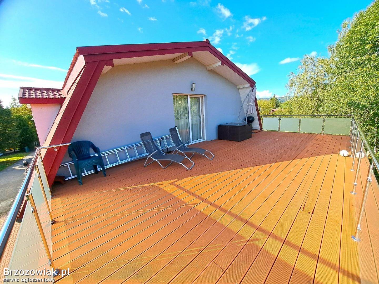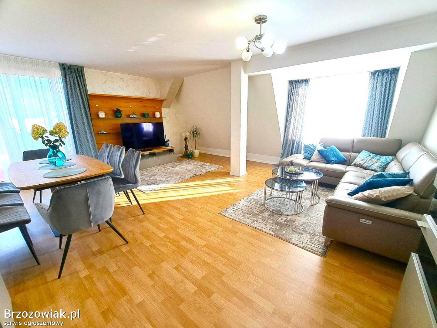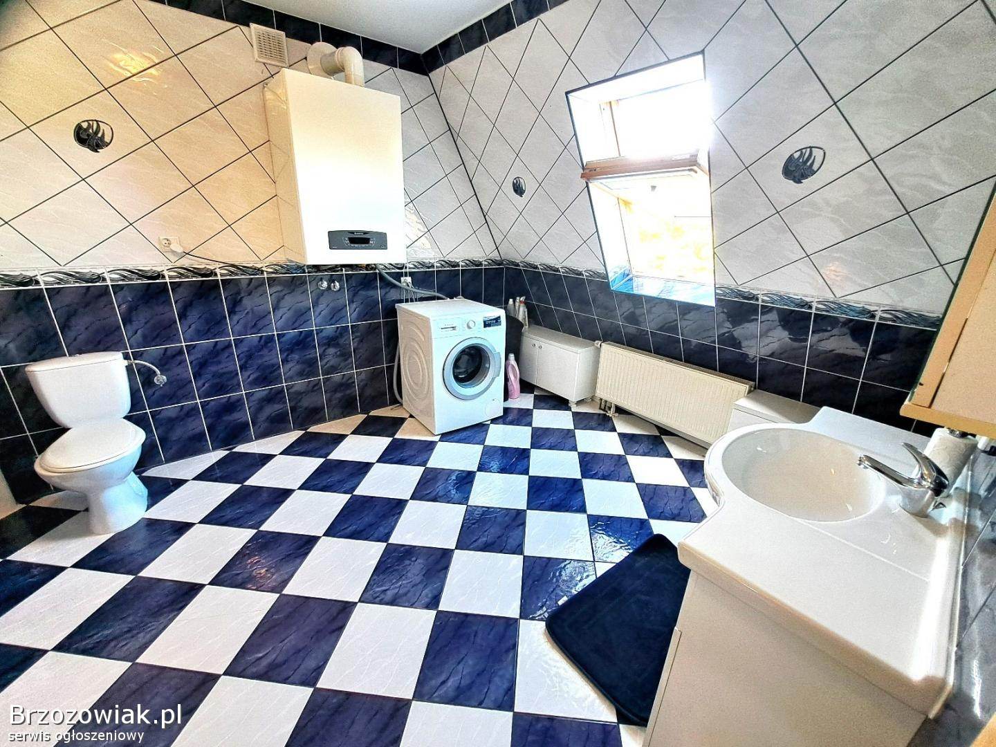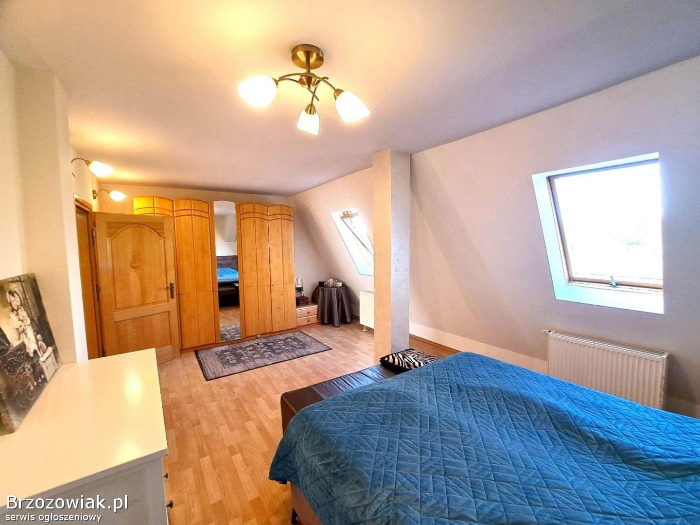 Na piętrze piękne mieszkanie składające się z salonu z wyjściem na duży taras, pokoju klubowego, 4 sypialni, kuchni z jadalnią, dwóch łazienek, korytarza. Mieszkanie wykończone w wysokim standardzie, ogrzewane piecem gazowym dwufunkcyjnym. Posesja ogrodzona, z utwardzonym podjazdem. Na tyłach budynku znajduje się zadbany ogród.