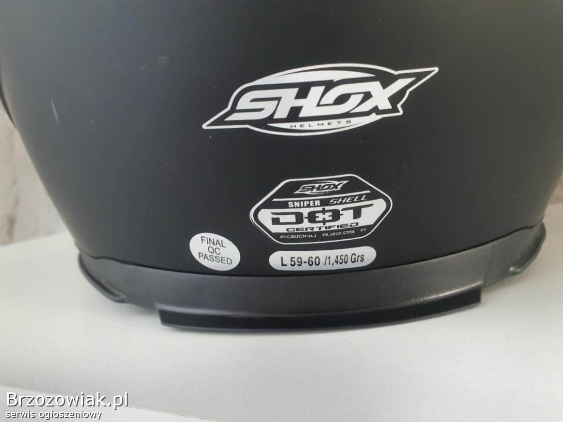 Sprzedam powystawowy kask motocyklowy Shox w rozmiarze L 59-60cm w kolorze czarny mat. W komplecie kask i pokrowiec.