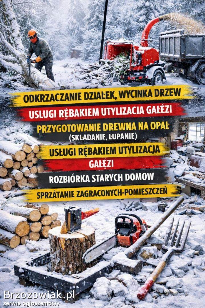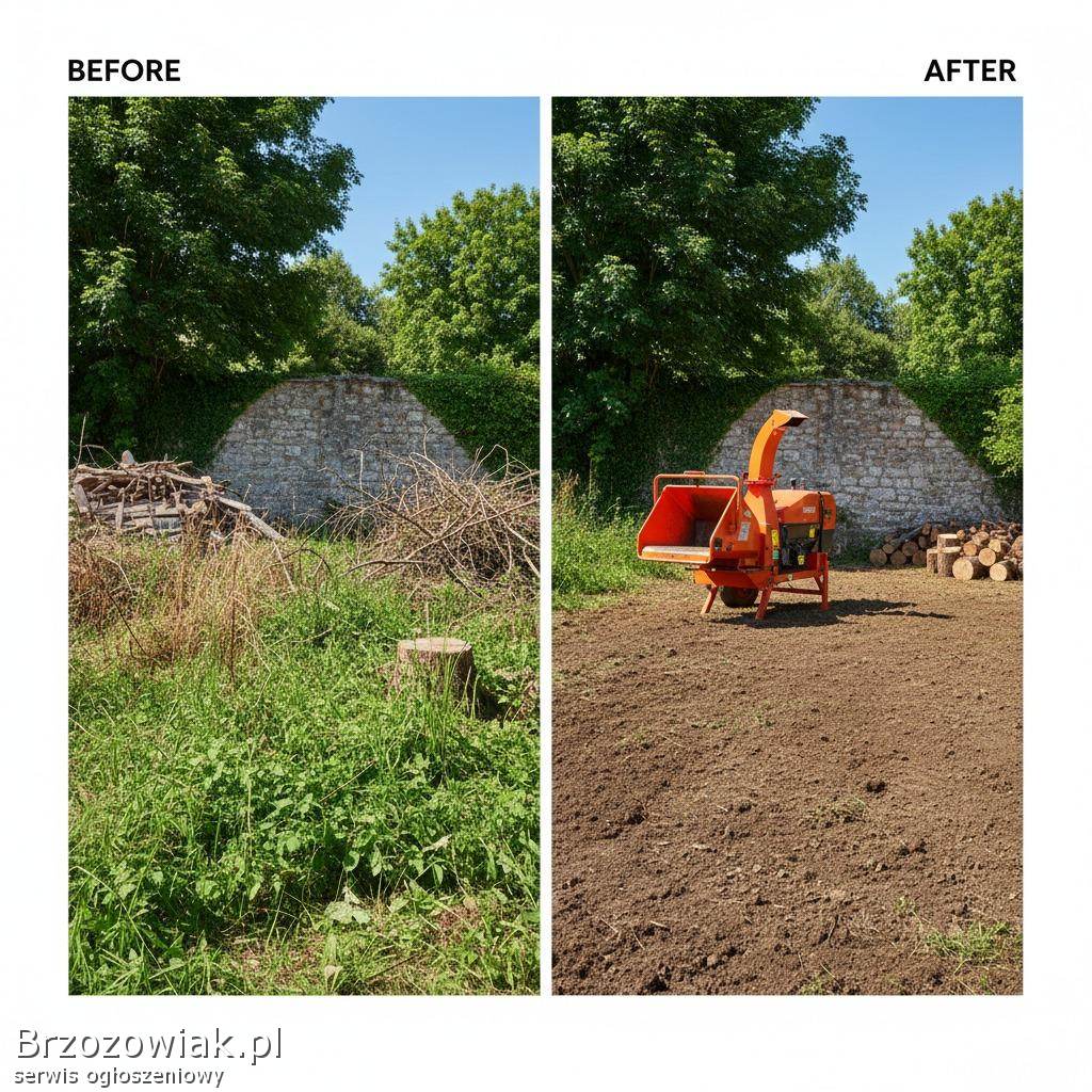 Działka: Odkrzaczanie, wycinka drzew oraz profesjonalna utylizacja gałęzi rębakiem.