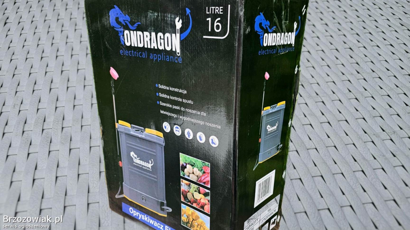 Pojemność zbiorika: 16 L Zasilanie: akumulatorowe Cisnienie robocze: 1, 5 - 4, 5 bar Typ pompy: membranowa Dlugość węża z uchwytemn: 120 cm Maksymalny czas oprysku po pelnym naladowaniu: do 5 h Wydajność na pojedynczej dyszy: 1, 5 - 1, 6 Vmin Wydajność na podwójnej dyszy: 1, 8 - 3 Vmin Napięcie nominalne akumulatora: 12V DC Pojemność akumulatora: 8 Ah Maksymalny czas ładowania:8 h Napięcie zasilania ladowarki: 230V / 50 Hz Prad ładowania tadowarki: 1, 2 A