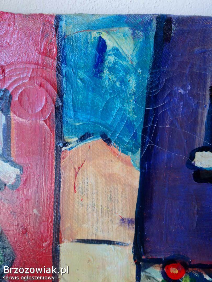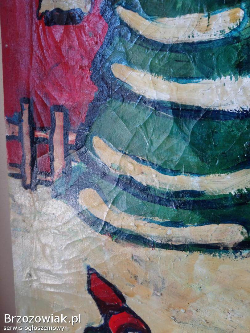 Na sprzedaż oryginalny obraz malowany farbami przedstawiający zimową, dziecięcą scenę z zabawkami i motywem świątecznym. Praca utrzymana w intensywnej, ekspresyjnej kolorystyce.
