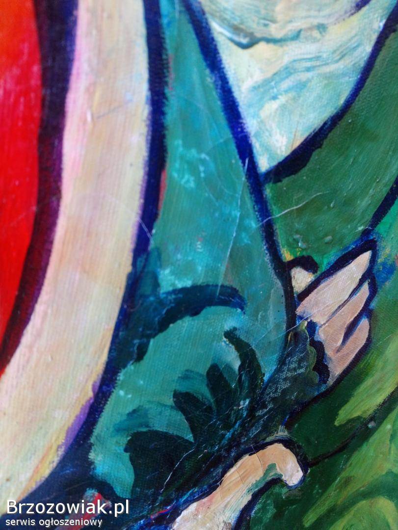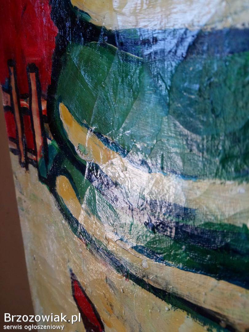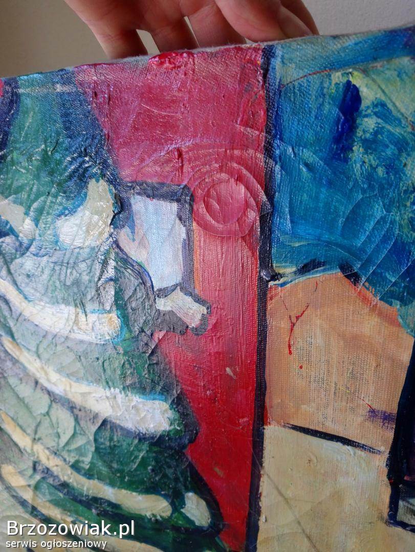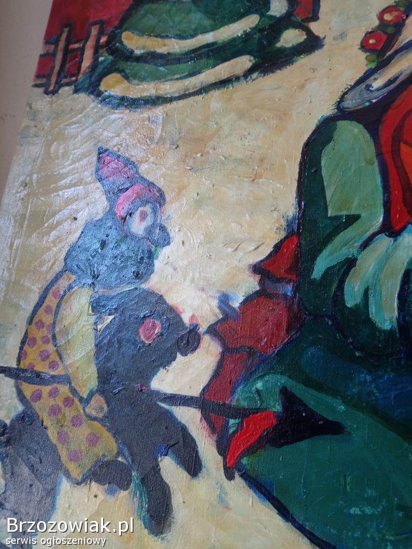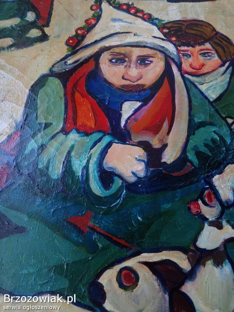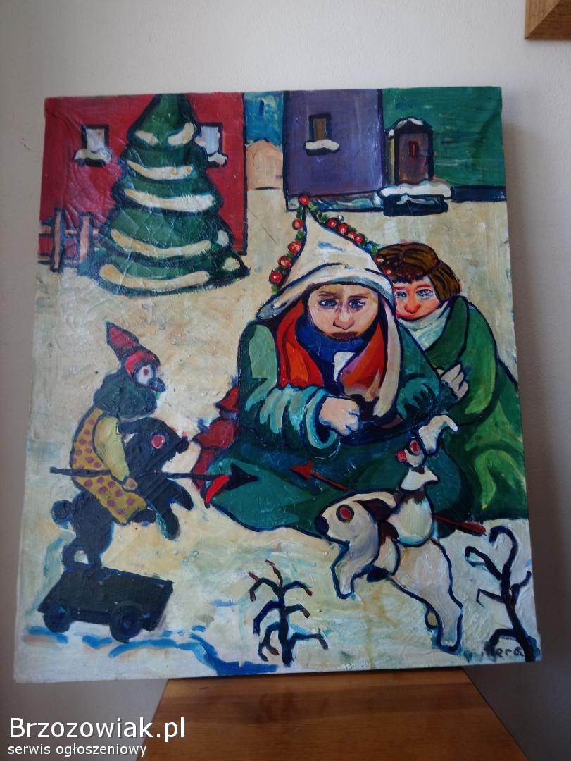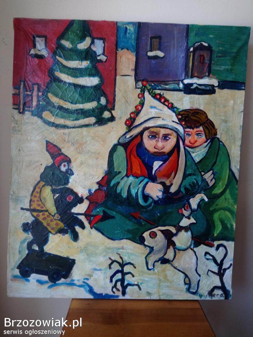 Na sprzedaż oryginalny obraz malowany farbami przedstawiający zimową, dziecięcą scenę z zabawkami i motywem świątecznym. Praca utrzymana w intensywnej, ekspresyjnej kolorystyce.
