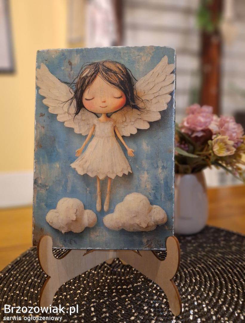 Obrazek na desce Aniołek wymiary Ok 20x14x2cm. Wykonany technika decoupage na drewno. Całość pokryta jest werniksem 2x. Polecam. obraz w ofercie jako ścienny.