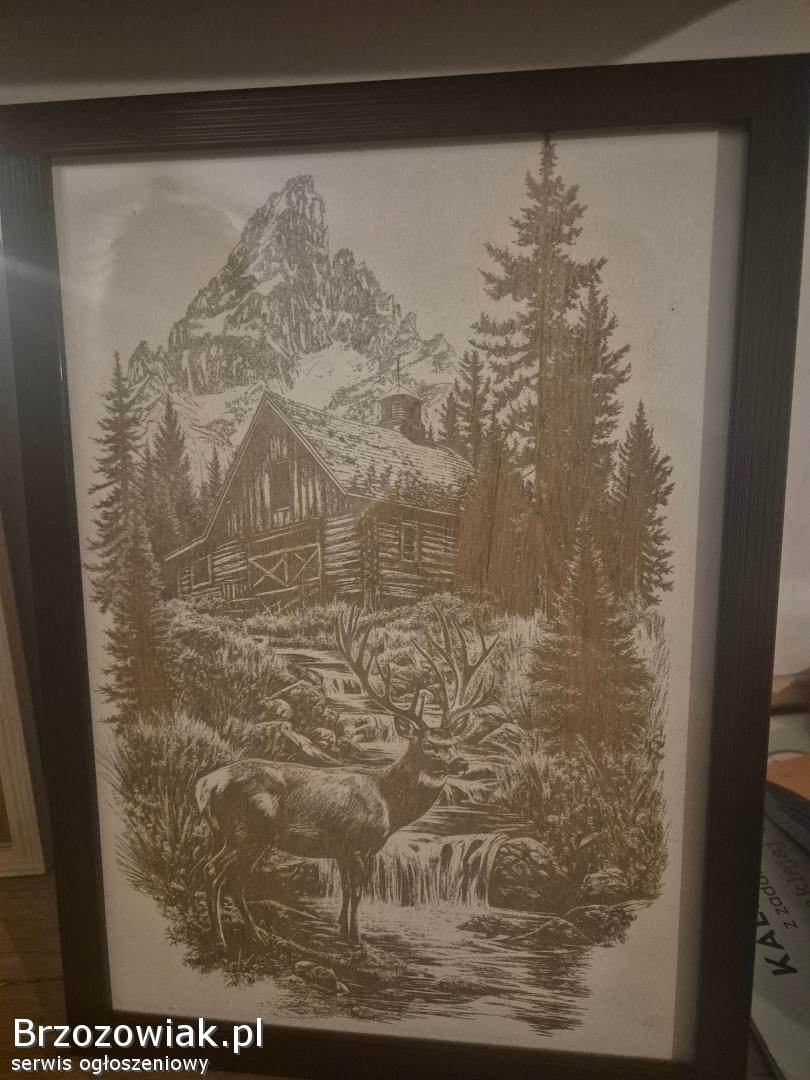 SanokObraz z motywem domku grawerowany laserowo na plotnie. Ozdoba salonu przedpokoju lub klatki schodowej. Wymiary 40x40. Cena 70 zl sztuka