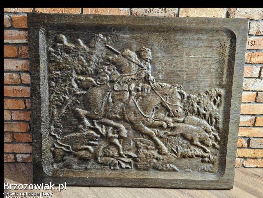 Sprzedam płaskorzeźbe z motywem polowania, materiał lite drewno. Wymiary 114 x 94