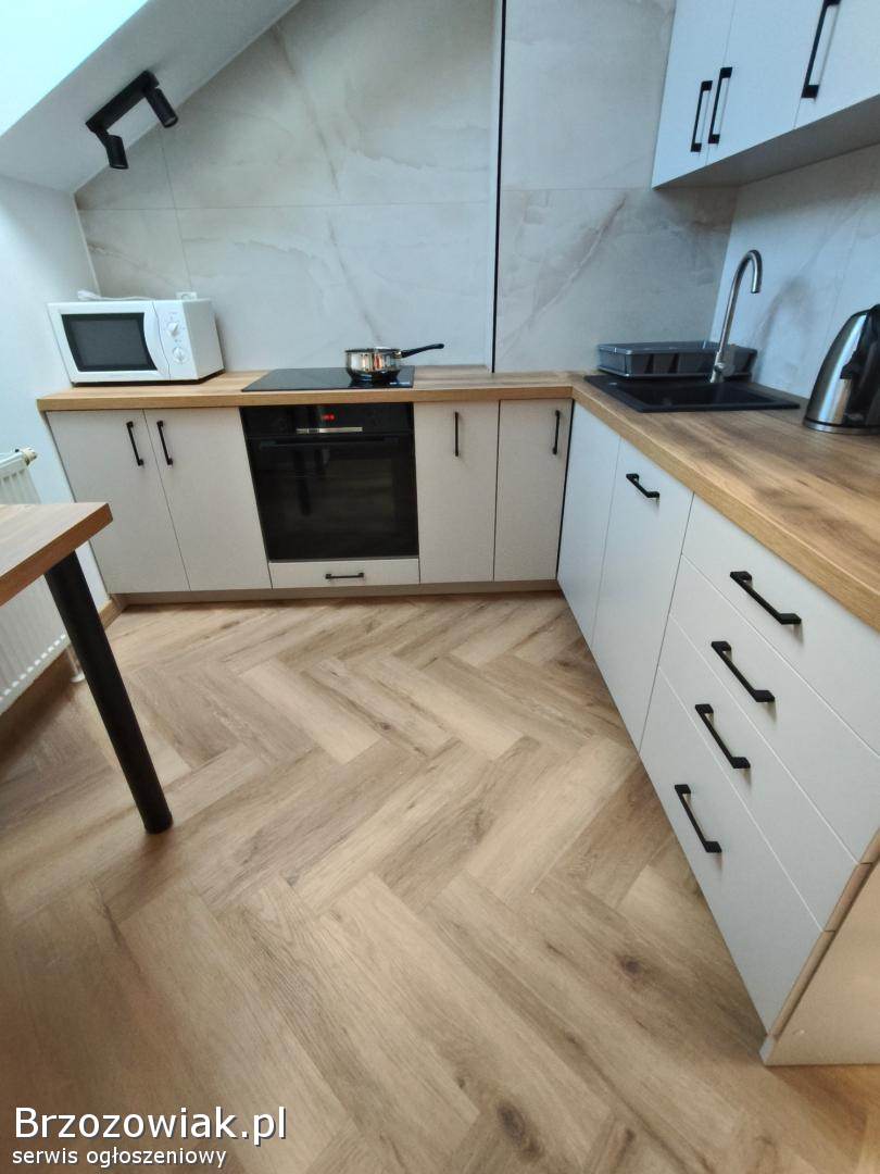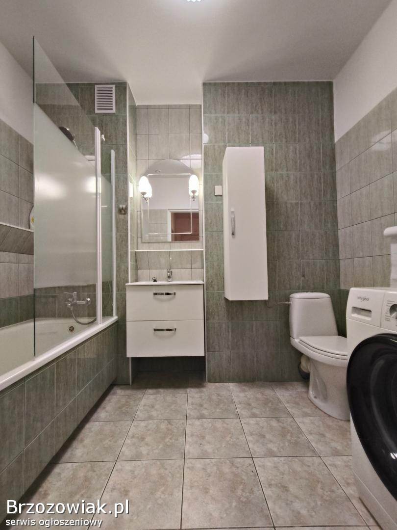 Łazienka z wanną zabudowaną przegrodą na prysznic, kuchnia w pełni umeblowana i wyposażona: lodówko-zamrażarka, kuchnia indukcyjna z piekarnikiem, zmywarka, mikrofala, czajnik elektryczny, pralka, odkurzacz, żelazko.