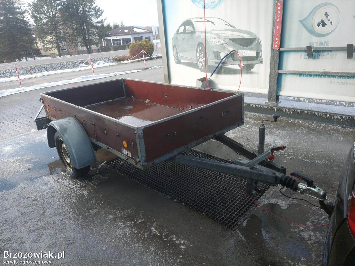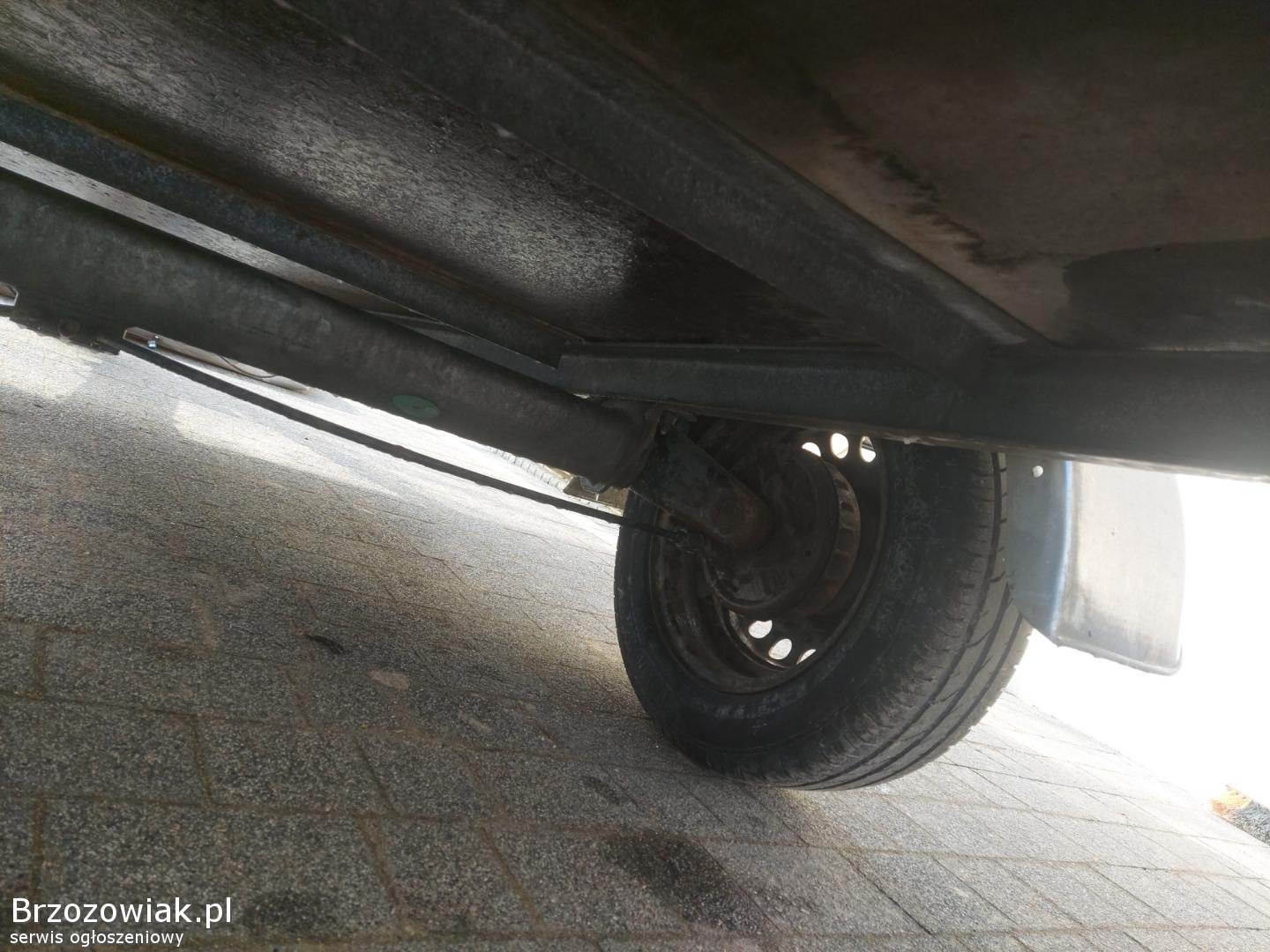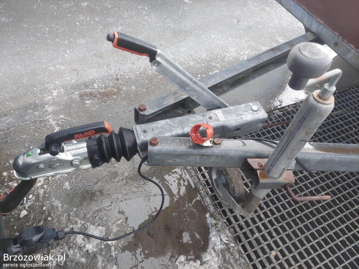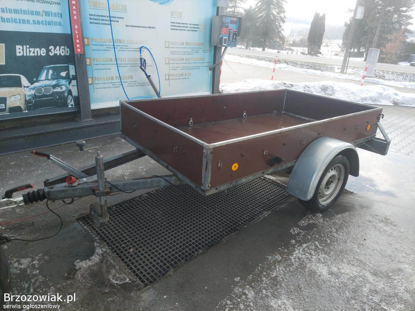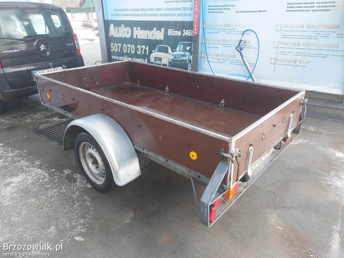 Przyczepa ma grubą twardą ramę, koła na wahaczach, konstrukcja bardzo solidna.
