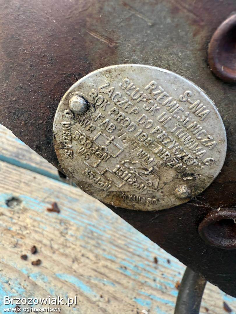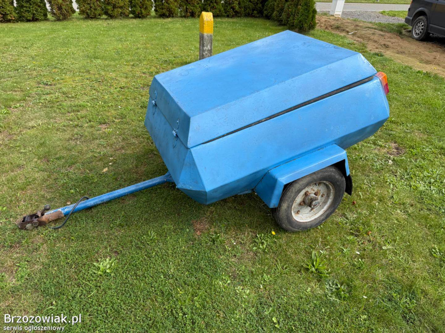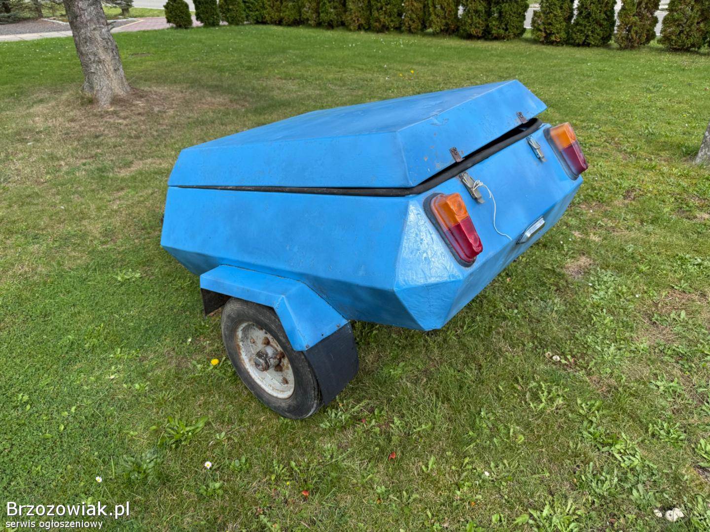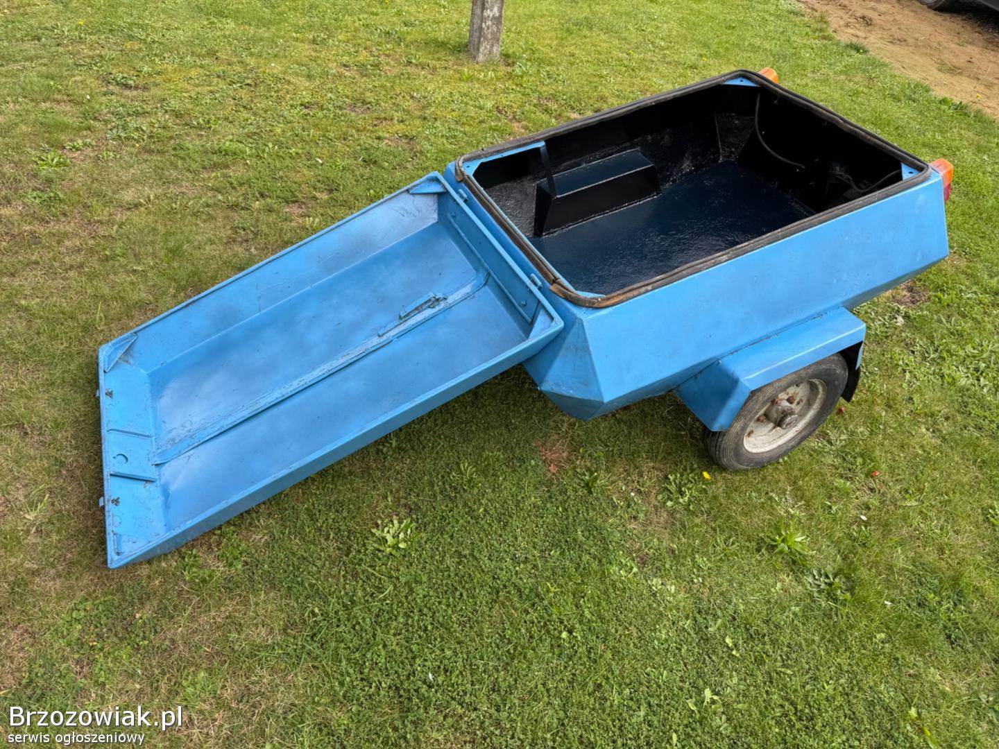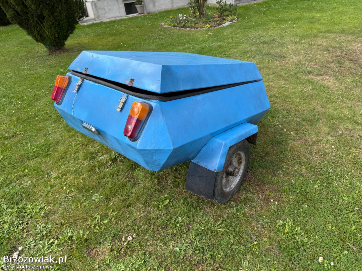 Przyczepka z lat 70/80, solidna stalowa konstrukcja, zamykana pokrywa, oryginalne lampy. Idealna na działkę, do ogrodu, na drewno, narzędzia albo jako baza do renowacji kolekcjonerskiej.