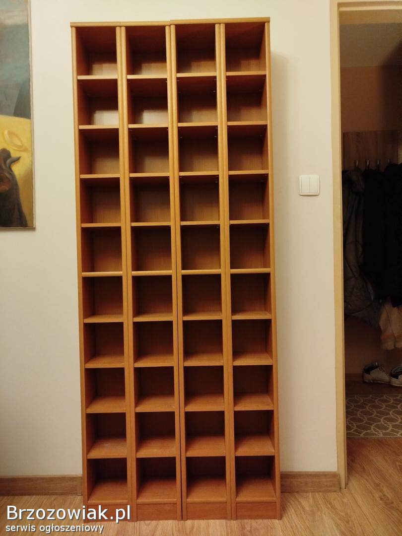 4 wąskie regały, na zdjęciu stoją razem. Przeznaczenie - płyty CD, ale można zagospodarować inaczej. Wysokość 182, szerokość pojedynczej 18 cm, czterech razem - 72, 5 cm. Głebokość 16 cm.