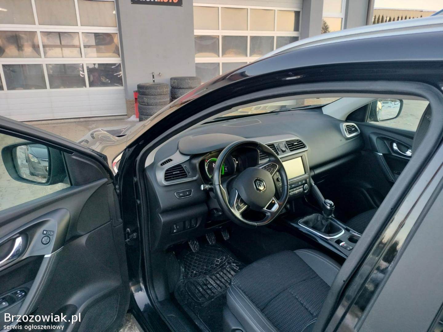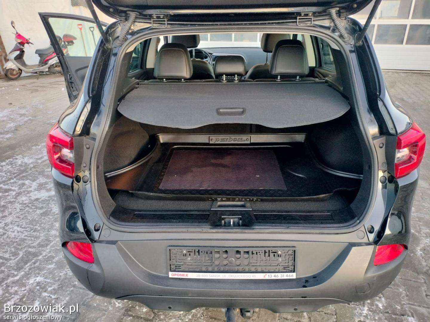 Wyposażenie tego Renault Kadjar jest imponujące i zaspokoi potrzeby nawet najbardziej wymagających kierowców. Wśród licznych udogodnień znajdziemy m. in. : nowoczesny system multimedialny z Bluetooth, USB, AUX, CD i MP3, zestaw głośnomówiący, klimatyzację dwustrefową automatyczną, system nawigacji, kierownicę wielofunkcyjną, czujniki parkowania, kamerę cofania oraz czujnik martwego pola. Dla komfortu podróżowania dostępne są również: komputer pokładowy, tempomat, wspomaganie kierownicy, czujnik deszczu oraz elektryczne lusterka i szyby. Bezpieczeństwo zapewniają systemy ABS, ASR, ESP, ISOFIX oraz liczne poduszki powietrzne i kurtyny powietrzne. Dodatkowymi atutami są światła LED, światła przeciwmgielne, szyberdach oraz welurowa tapicerka. System start-stop przyczynia się do oszczędności paliwa, a system bezkluczykowy ułatwia codzienne użytkowanie.