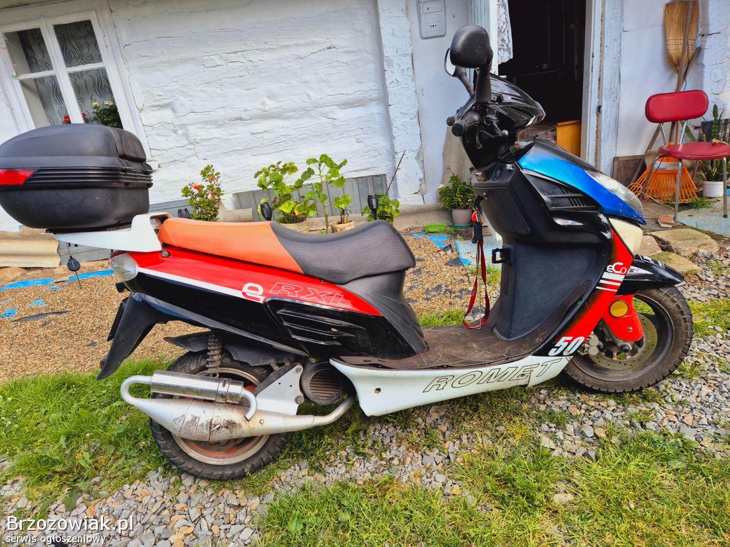 Skuter w stanie dobrym. Używany przez kobietę. Romet 50 RXL 2t 2013r. Ubezpieczenie do 15 lipca 2025r.