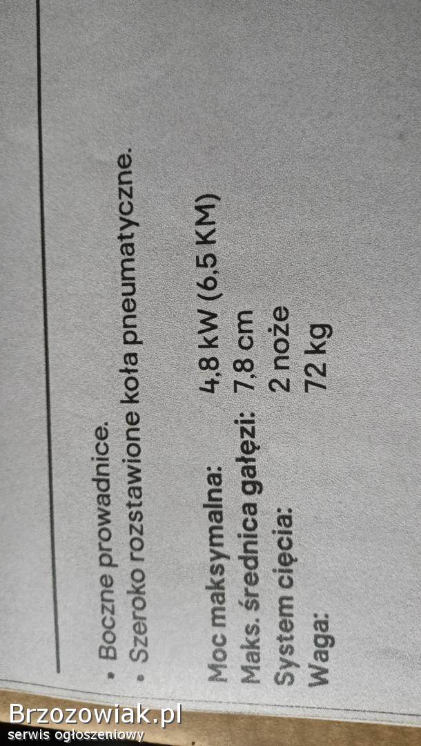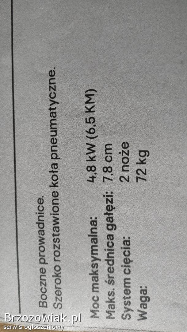 Sprzedam nowy rozdrabniacz gałęzi spalinowy o mocy 4, 8kW (6, 5KM) max grubość rozdrabnianych gałęzi 7, 8cm, 2 noże waga 72 kg cena 3499zł