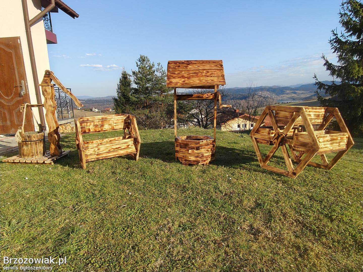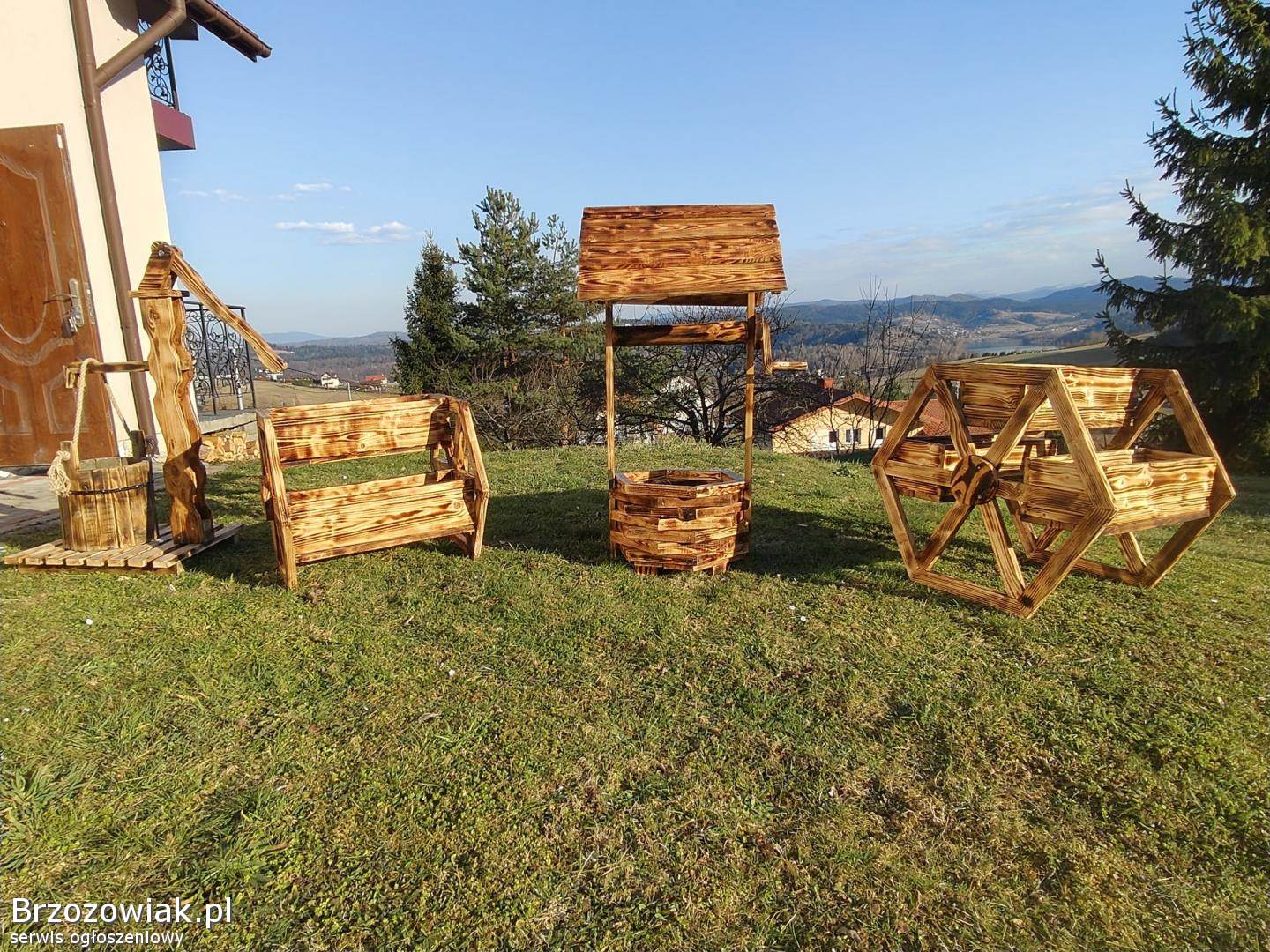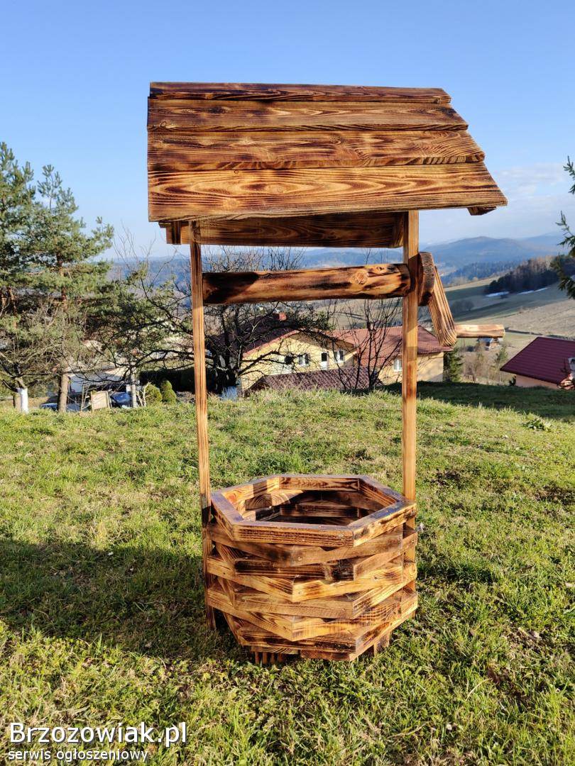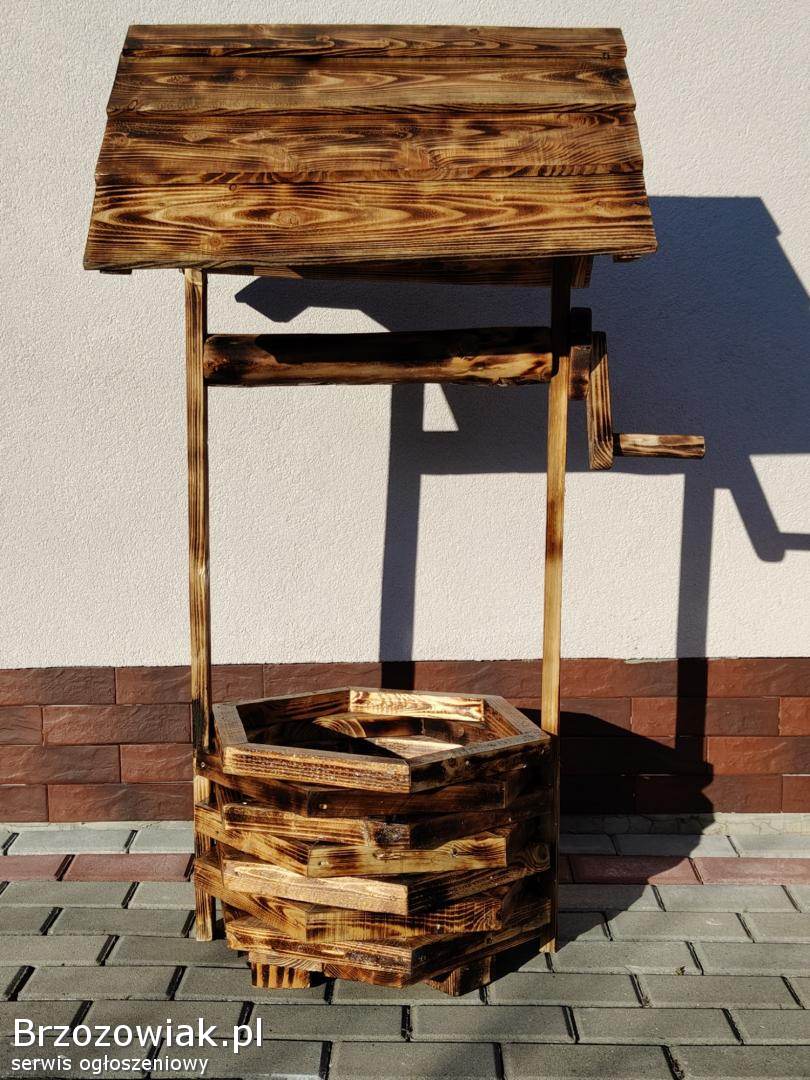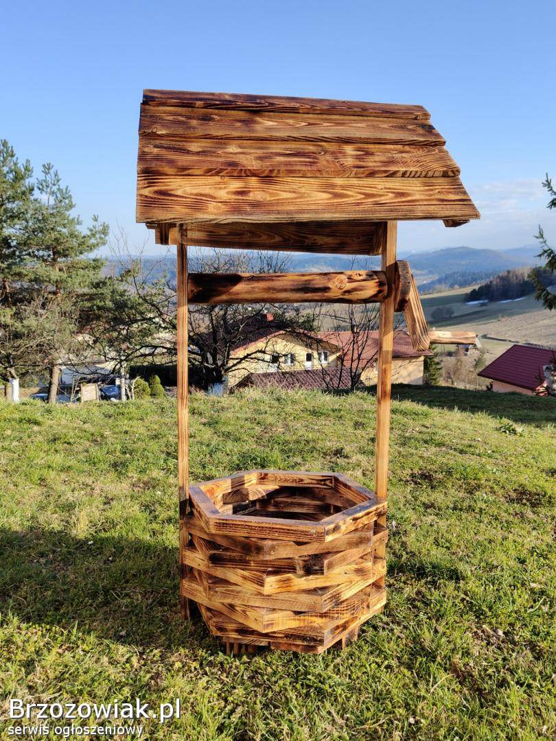 Oferuję piękną, ręcznie wykonaną drewnianą doniczkę w kształcie studni, która doskonale ozdobi Twój ogród, taras lub podwórko.