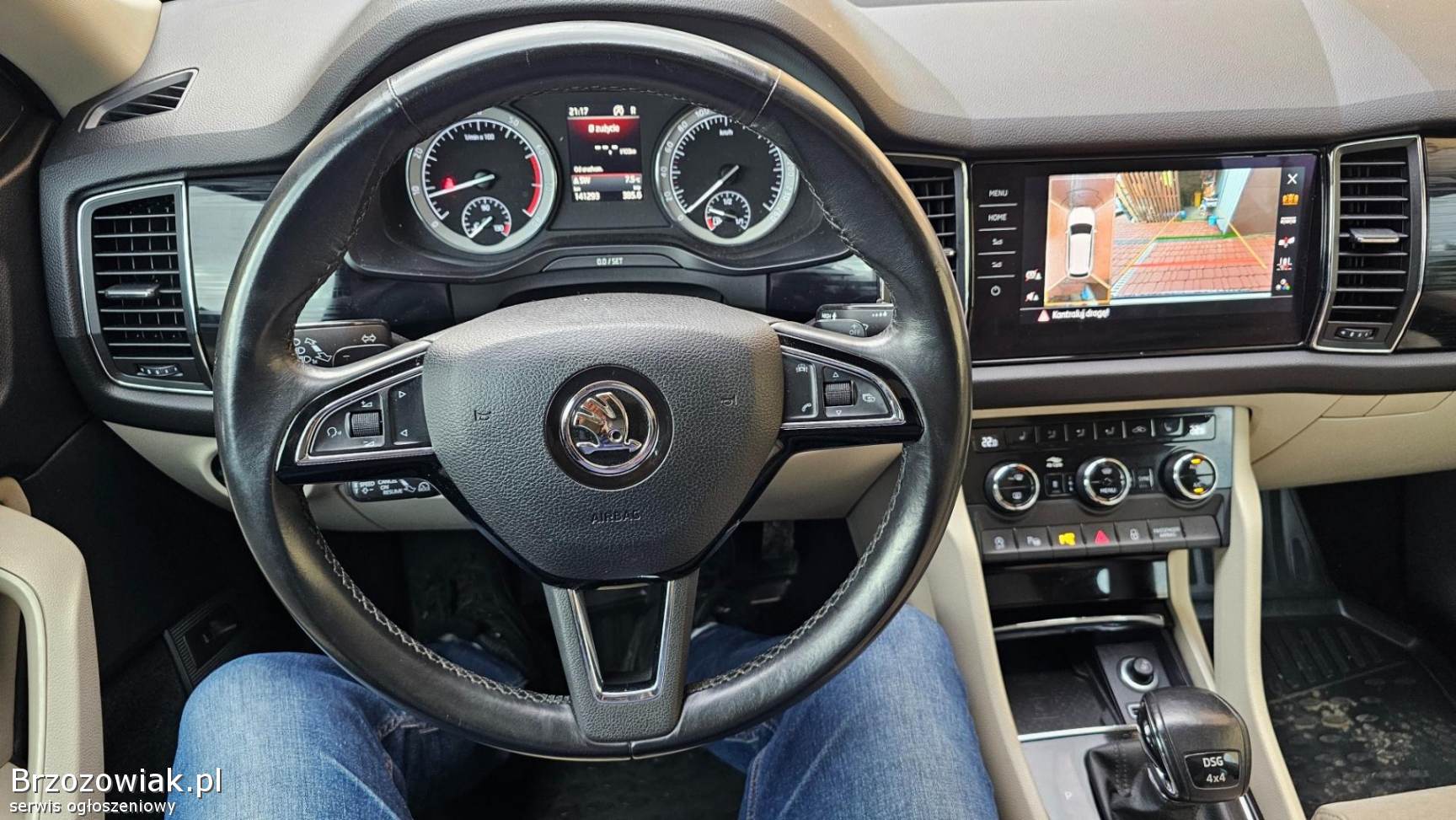 Wyposażenie Skody Kodiaq jest imponujące i obejmuje między innymi: system nawigacji, aktywny tempomat, asystenta pasa ruchu, czujniki parkowania wraz z kamerą cofania, a także czujnik martwego pola, co znacząco podnosi bezpieczeństwo podczas jazdy. System multimedialny z Bluetooth, USB, AUX, funkcjami Android Auto i CarPlay umili każdą podróż. Dodatkowe atuty to panoramiczny dach, podgrzewane fotele, elektrycznie regulowane fotele, elektrycznie otwierany bagażnik oraz światła LED i skrętne światła zapewniające doskonałą widoczność. Pojazd posiada również komplet opon zimowych i relingi dachowe, co czyni go gotowym na każde wyzwanie.