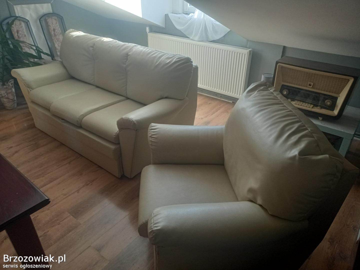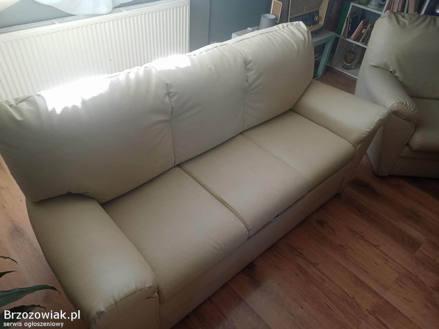 Sprzedam sofę rozkładaną o wymiarach 190cm na 100 cm plus dwa fotele do kompletu o wymiarach 100x100cm wszystko w bardzo ładnym stanie w kolorze beżowym, eko skóra