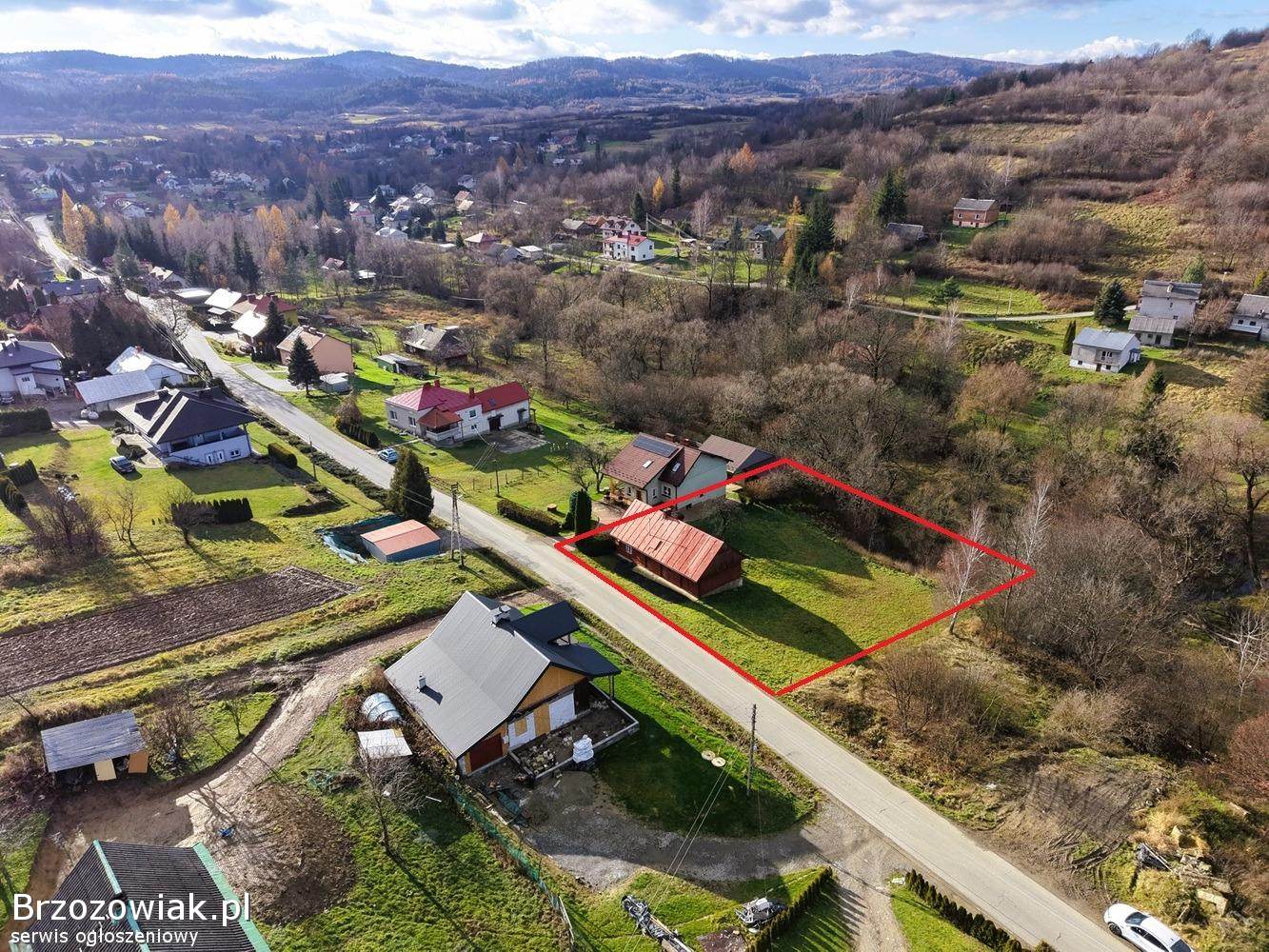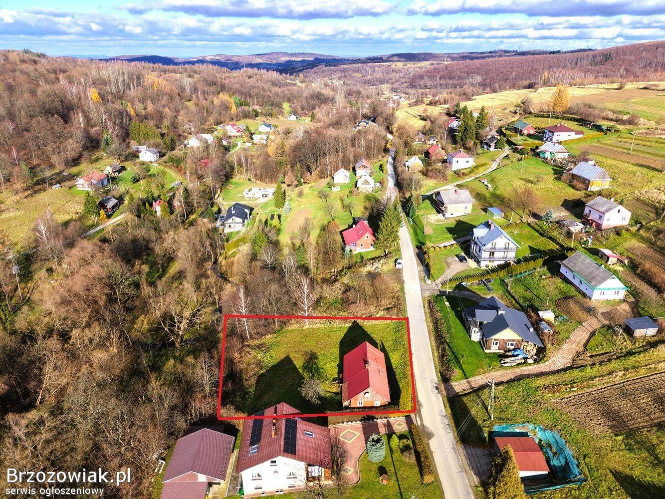 Dom usytuowany jest na przestronnej działce o powierzchni 14 arów, z dojazdem asfaltową drogą publiczną, co gwarantuje wygodny dostęp przez cały rok.