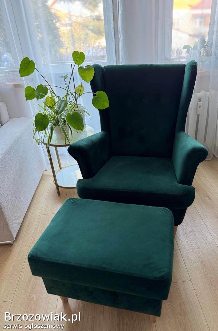 Na sprzedaż oferuję wygodny i elegancki fotel typu uszak w zestawie z podnóżkiem posiadającym funkcję schowka. Mebel w pięknym, modnym kolorze butelkowej zieleni, który świetnie wpasuje się w nowoczesne oraz klasyczne wnętrza.