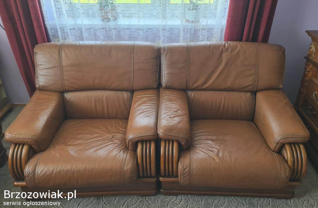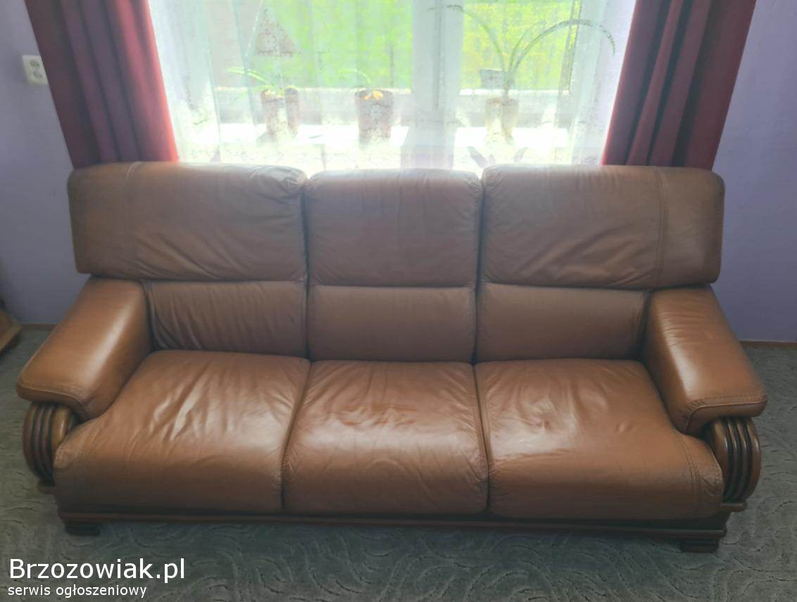 Sprzedam komplet mebli skórzanych. W skład kompletu wchodzi 3-osobowa kanapa oraz dwa masywne, duże fotele. Stan wypoczynku dobry. Kanapa posiada funkcję spania.