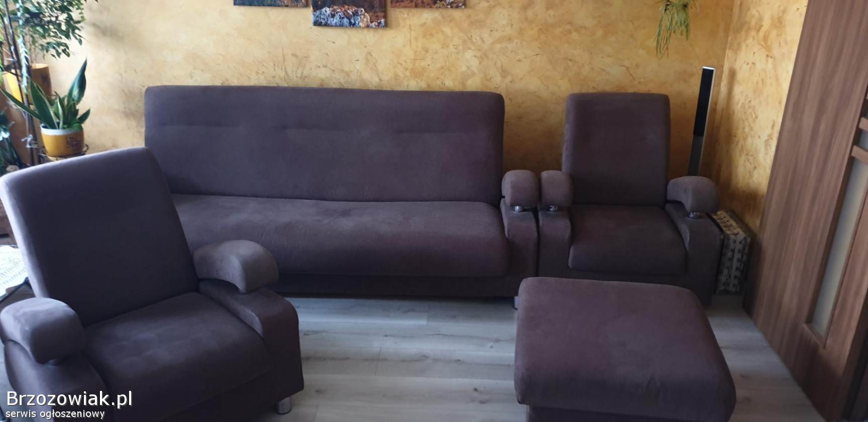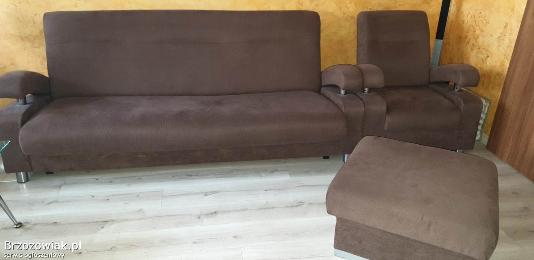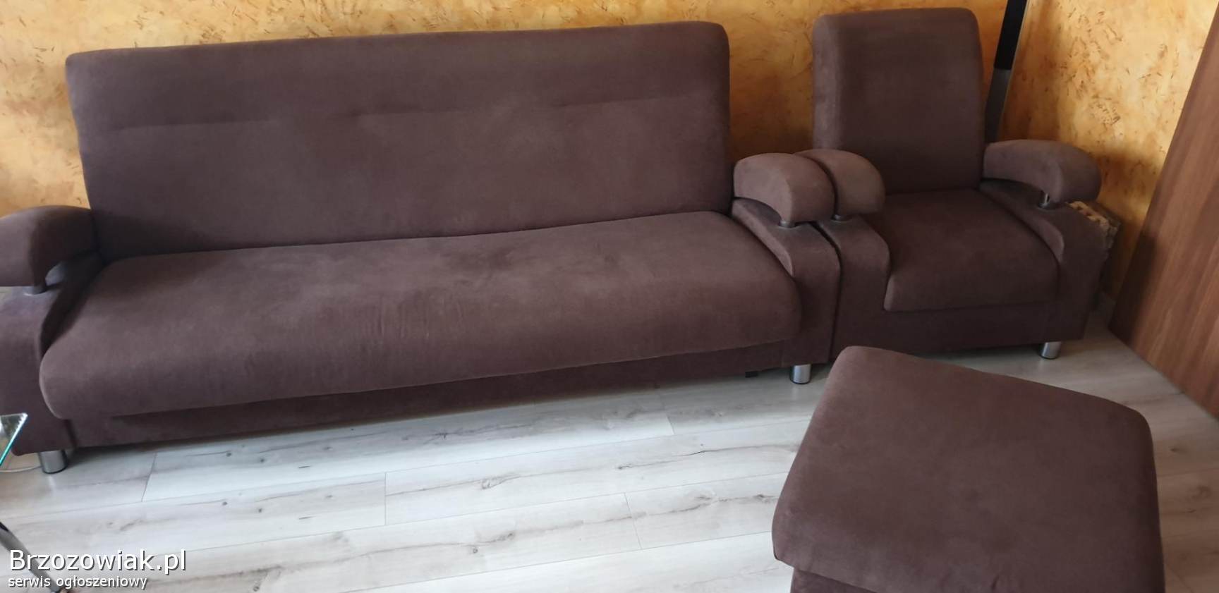 Mam do sprzedania wypoczynek w bardzo dobrym stanie z dwoma fotelami i dużą pufą w kolorze brązu po renowacji tapicerskiej. Odbiór tylko osobisty. Tel. 603885985