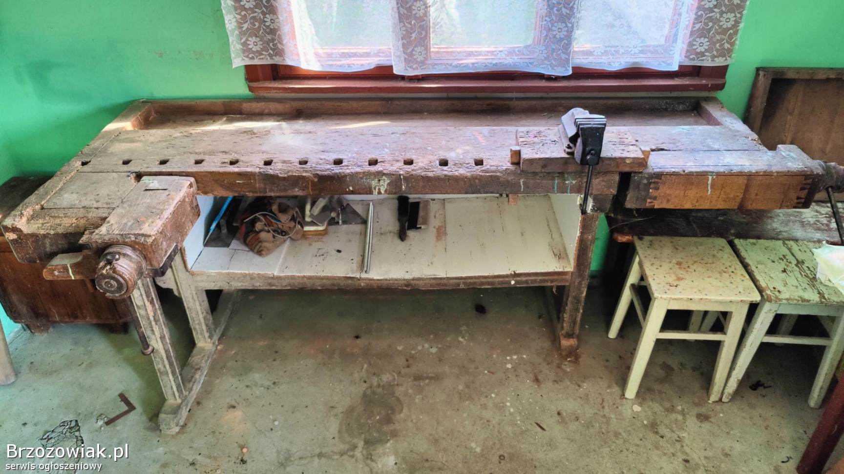 To świetna propozycja dla kolekcjonera starych narzędzi, stolarza lub początkującego majsterkowicza. Stół, choć ma swoje lata, jest ciężki i stabilny – nadaje się do pracy w warsztacie. Narzędzia mogą posłużyć do dalszego użytkowania lub jako baza do odnowienia.