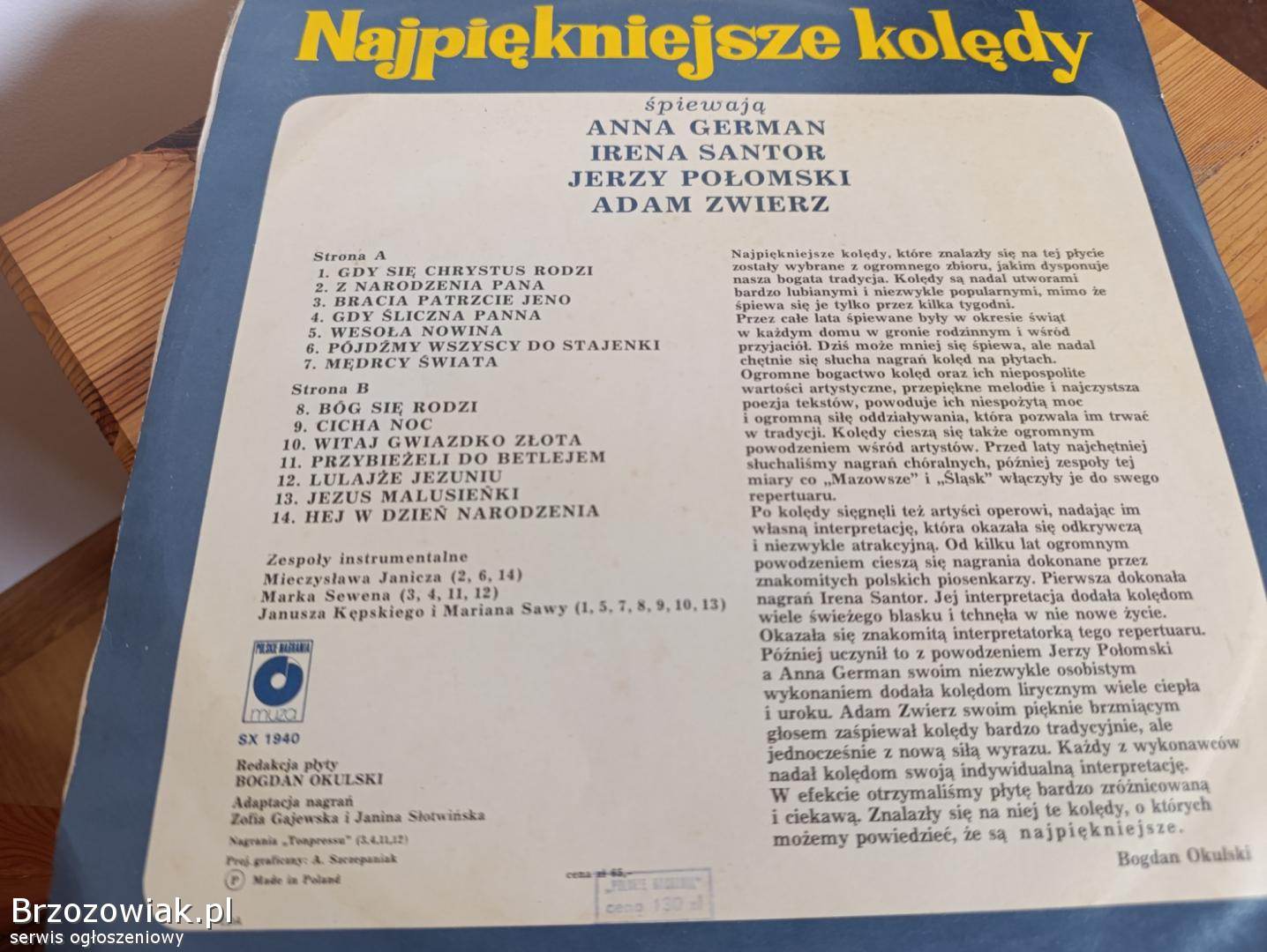 Sprzedam vinyl z lat 80 najpiękniejsze Polskie kolędy wykonanie Anna German, Irena Santor, Jerzy Połomski, Adam Zwierz, oryginalne opakowanie, ze starymi pieczątkami cena 50 zl