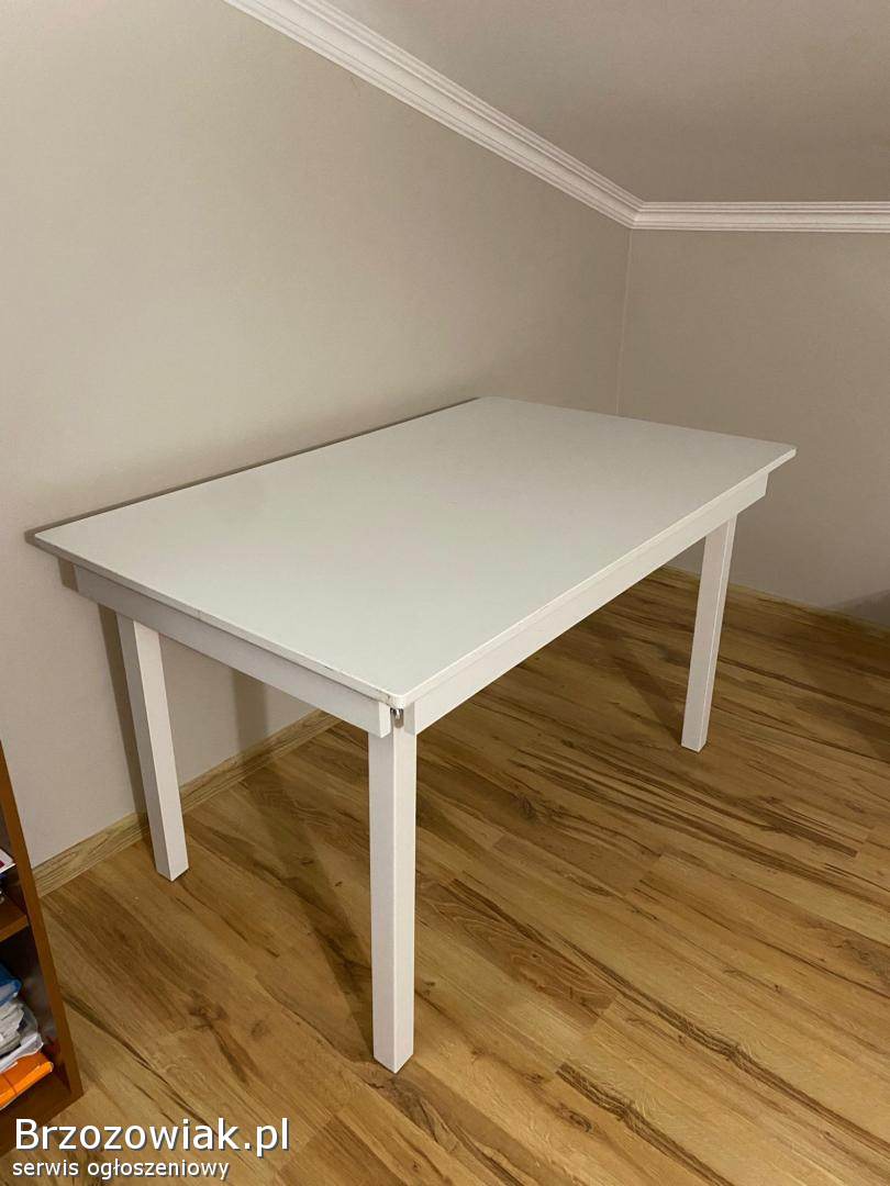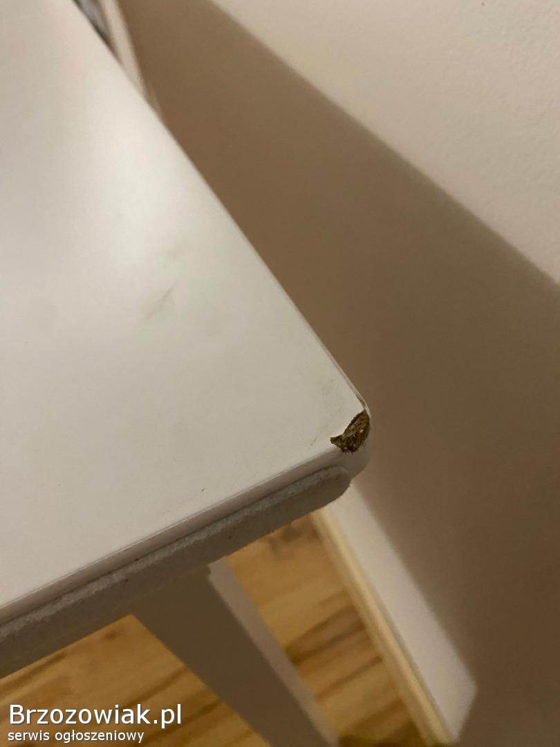 Biały stół JYSK o wym. 120 x 75 w stanie dobrym. Stół ma odkręcane nogi, wiec jest łatwy w przechowywaniu w razie potrzeby. Ma wadę na narożniku co widać na zdjęciu.