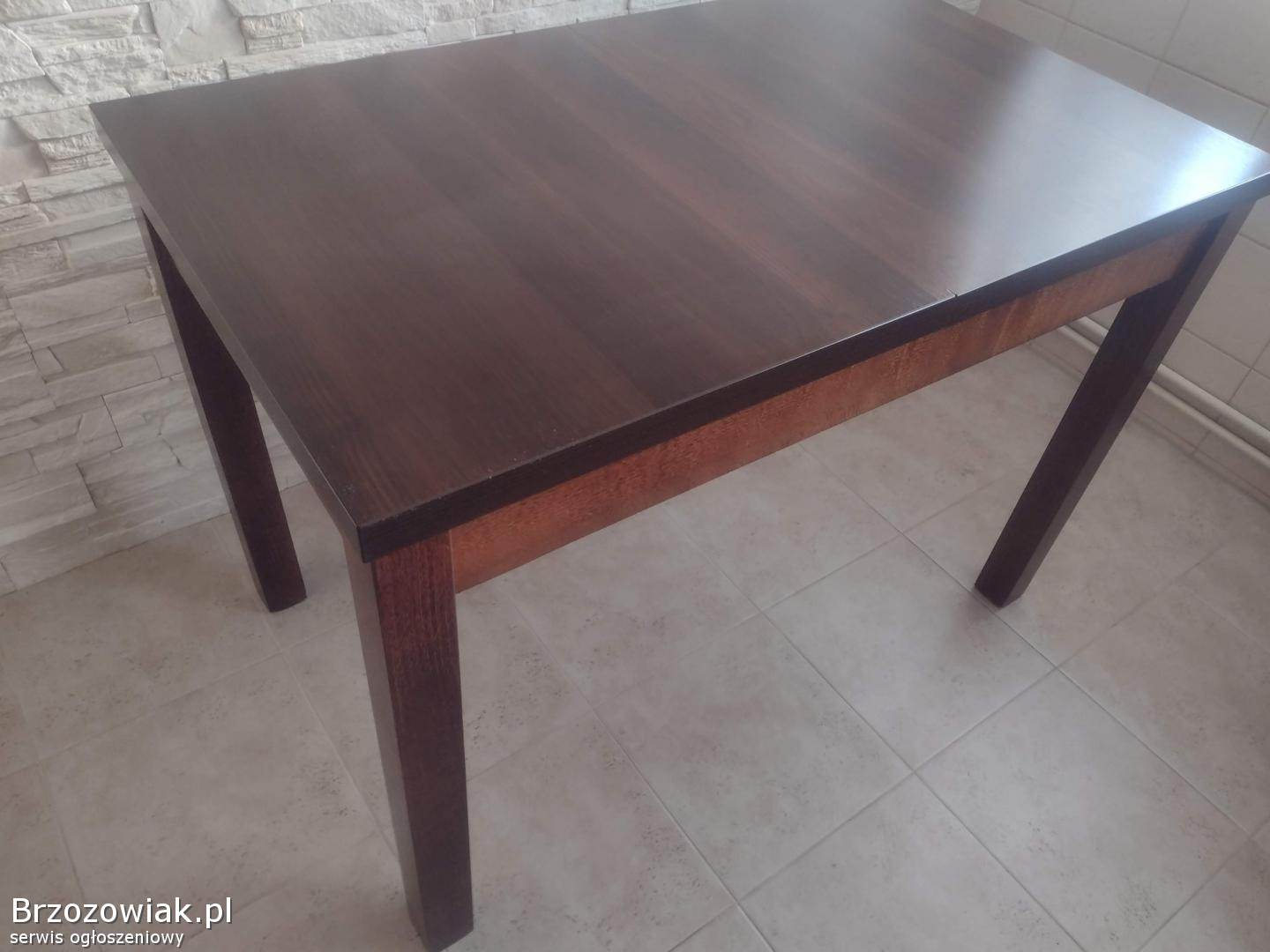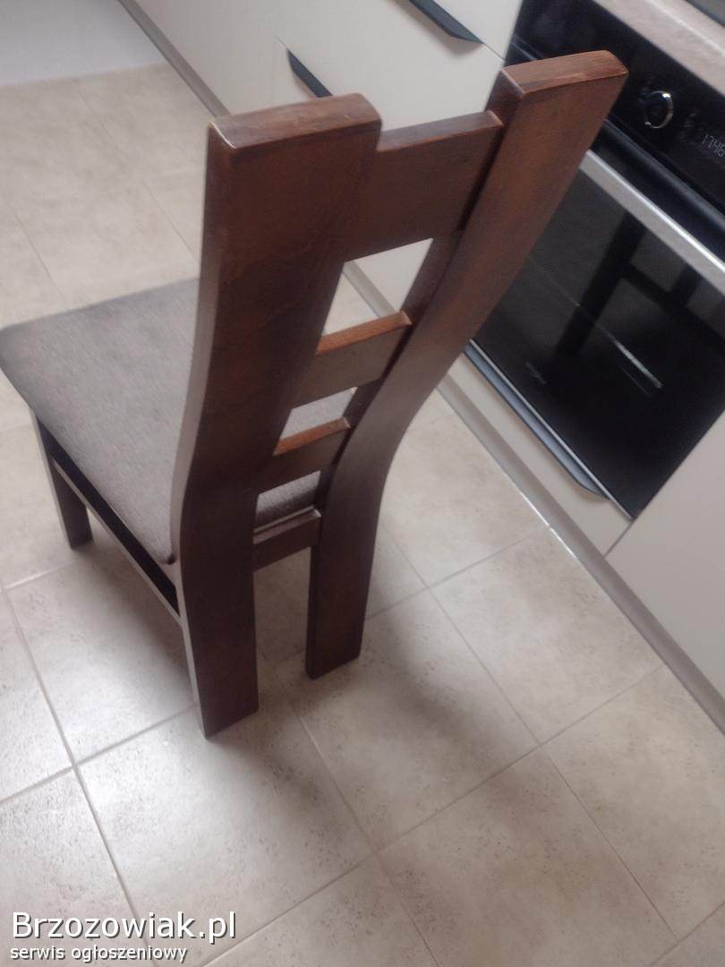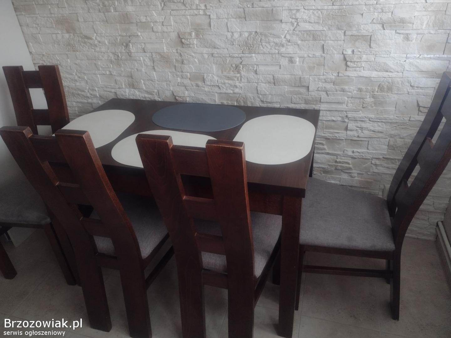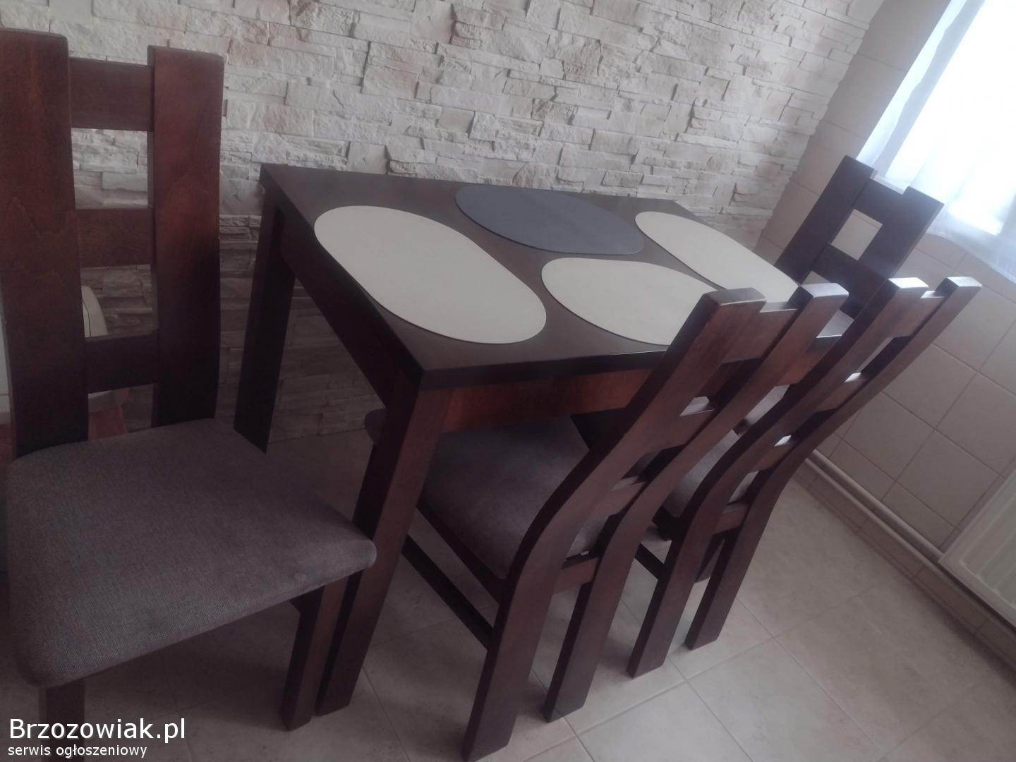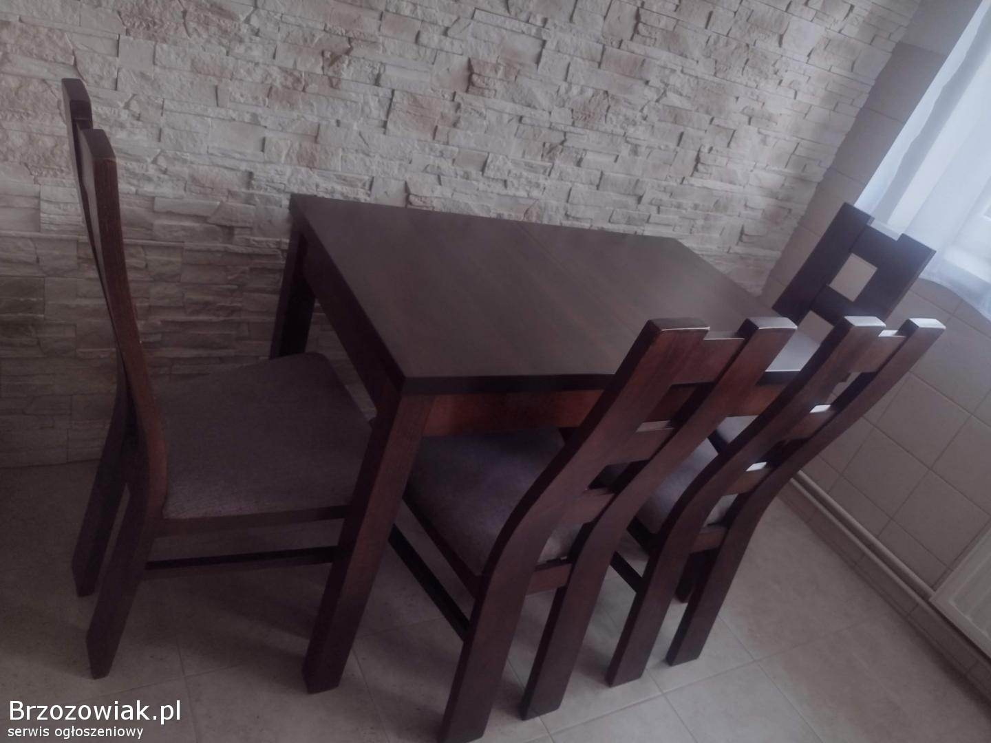 Stylowy, drewniany zestaw stołu i krzeseł, idealny do jadalni lub kuchni. Ciemnobrązowy kolor mebli doskonale komponuje się z kamienną ścianą. Konstrukcja zapewnia trwałość i stabilność. O więcej informacji proszę pytać. Odbior osobisty. Cena do negocjacji.