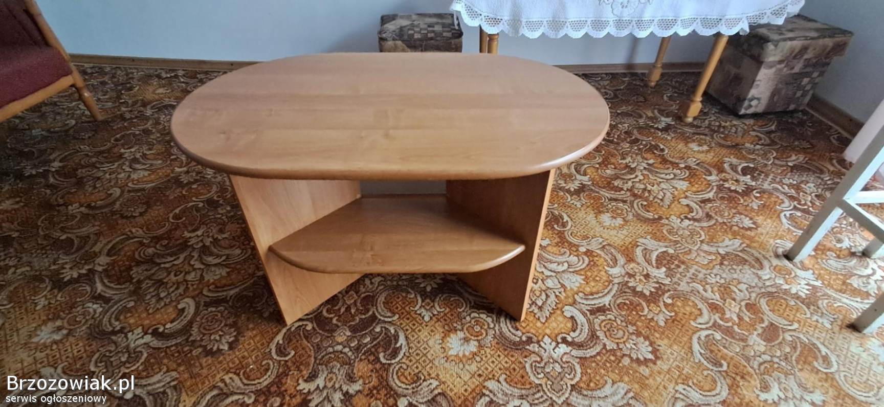 Mebel ma owalny blat oraz dolną półkę na gazety, książki lub piloty.