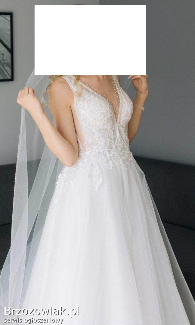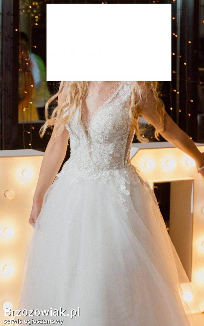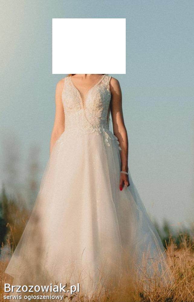 Elegancka suknia ślubna z kryształkami, w kolorze śmietankowym. Suknia jest na wzrost 175cm + 7 cm obcas. Z tyłu zapinana jest na guziki, dołem zamek. Od wewnątrz jest na wiązanie. Druga warstwa to gwiezdny pył. Ślicznie się mieni. Dół zakończony jest specjalną taśmą, która sprawia, że ładnie się układa.