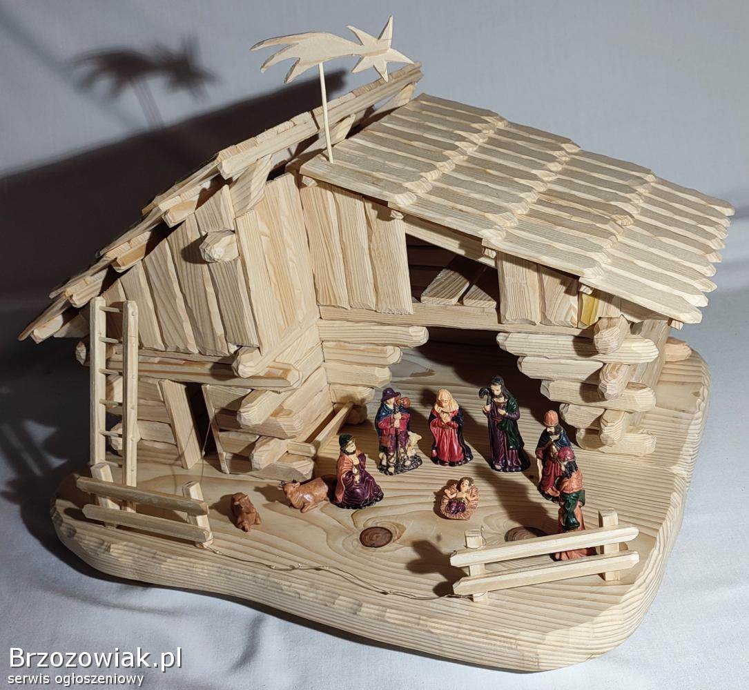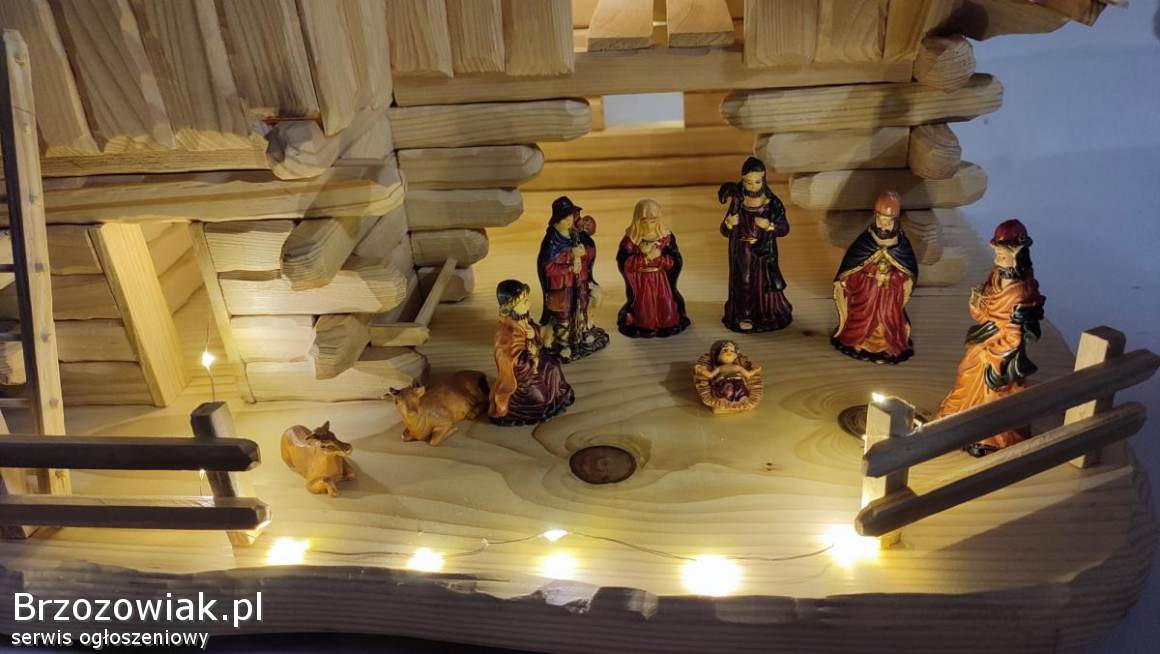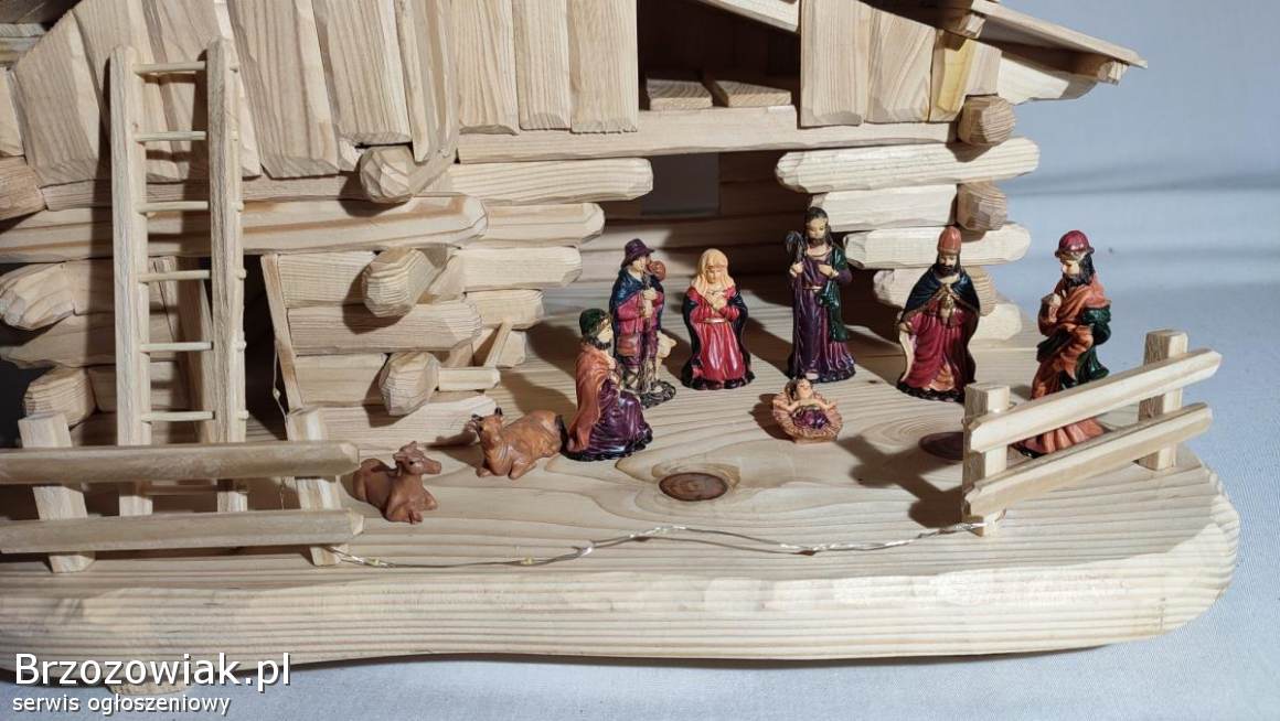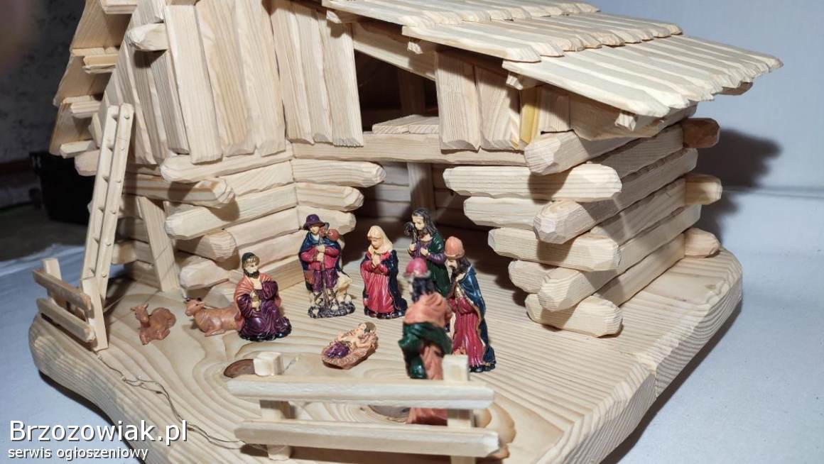 Szopka bożonarodzeniowa ręcznie wykonana z drewna świerkowego. Zaimpregnowana lakierem satynowym. W zestawie komplet figurek i oświetlenie do rozmieszczenia według uznania. Wymiary to ok. 53 cm długości, 41 cm wysokość i 42 cm szerokości. Mnóstwo godzin pracy, ale gwarantowane wrażenia, zdj. nie oddają tak wyglądu. Element dekoracyjny mieszkania na długie lata. Ceny podobnych znacznie wyższe. Odbiór Krosno i okolice. Kontakt przez mail