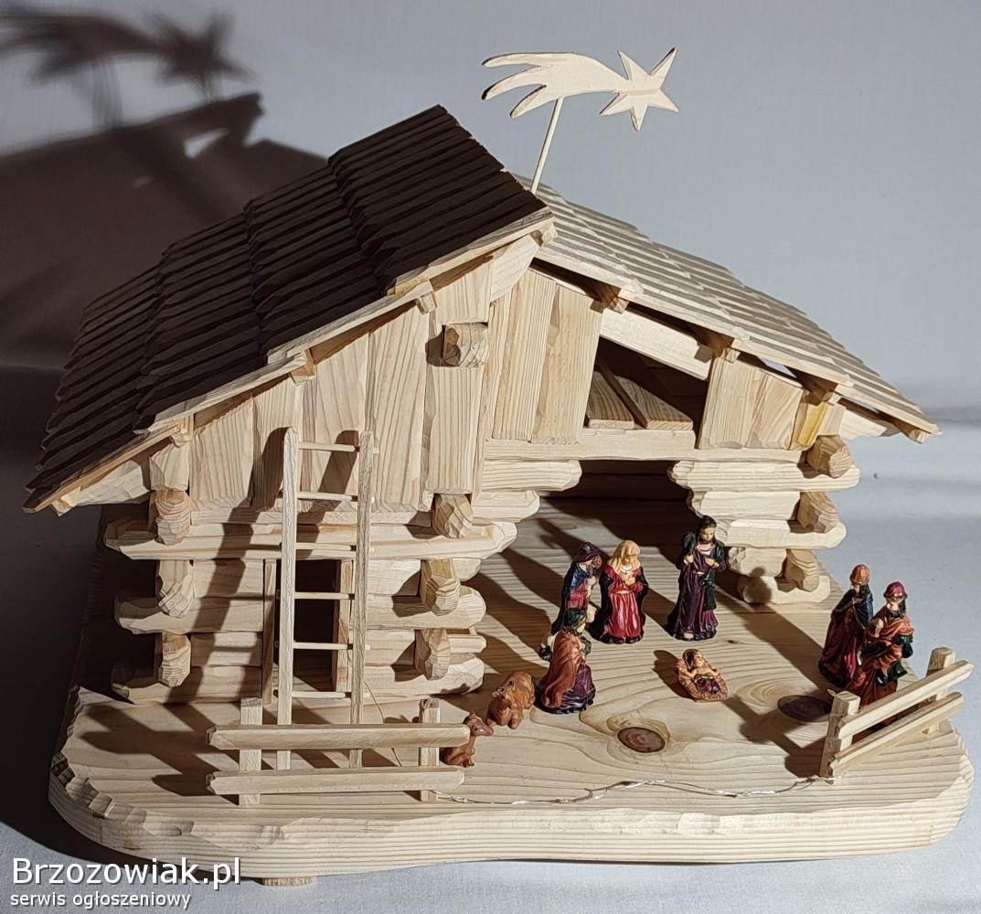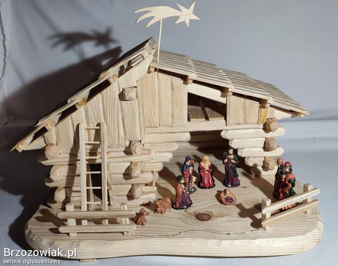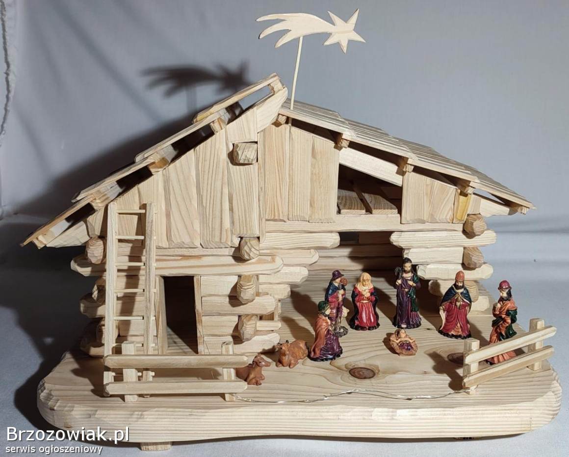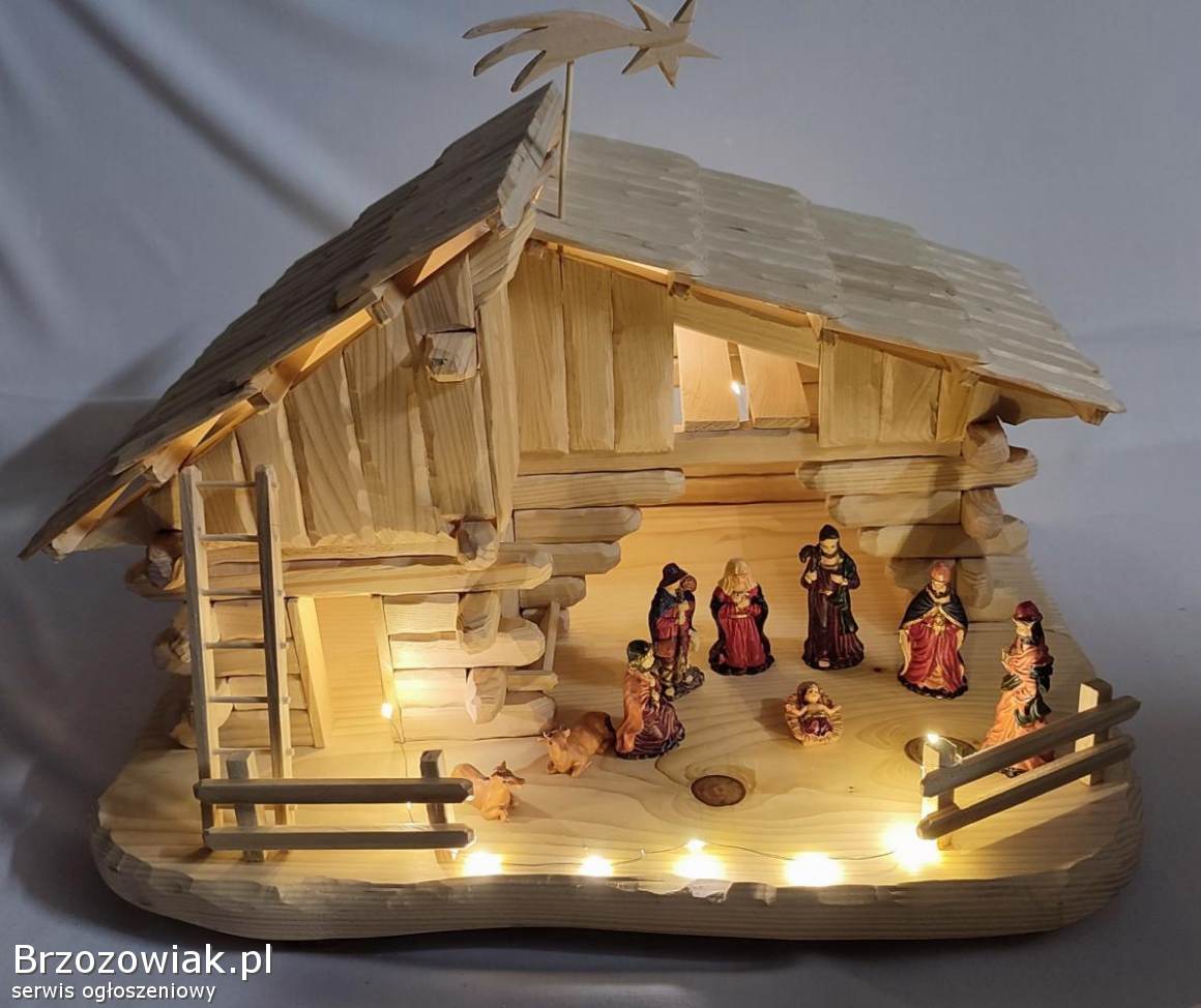 Szopka bożonarodzeniowa ręcznie wykonana z drewna świerkowego. Zaimpregnowana lakierem satynowym. W zestawie komplet figurek i oświetlenie do rozmieszczenia według uznania. Wymiary to ok. 53 cm długości, 41 cm wysokość i 42 cm szerokości. Mnóstwo godzin pracy, ale gwarantowane wrażenia, zdj. nie oddają tak wyglądu. Element dekoracyjny mieszkania na długie lata. Ceny podobnych znacznie wyższe. Odbiór Krosno i okolice. Kontakt przez mail