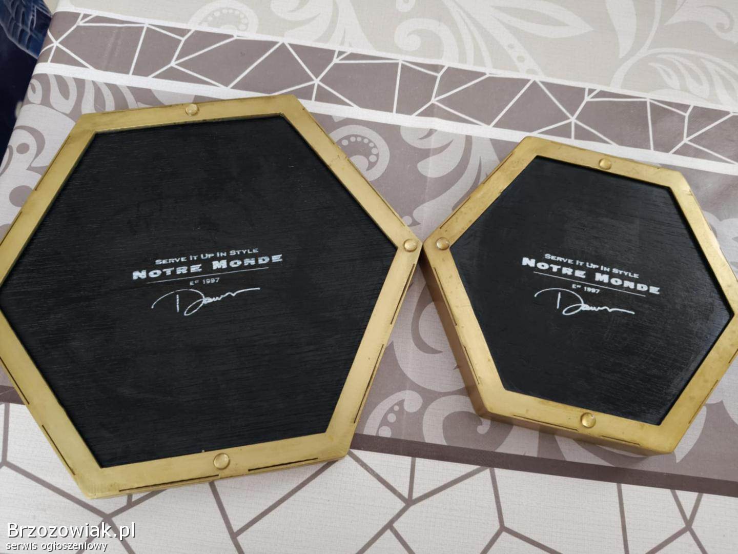 Przedstawiony na zdjęciu przedmiot to sześciokątne tace dekoracyjne w złotym kolorze, marki Notre Monde.