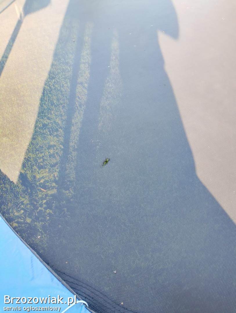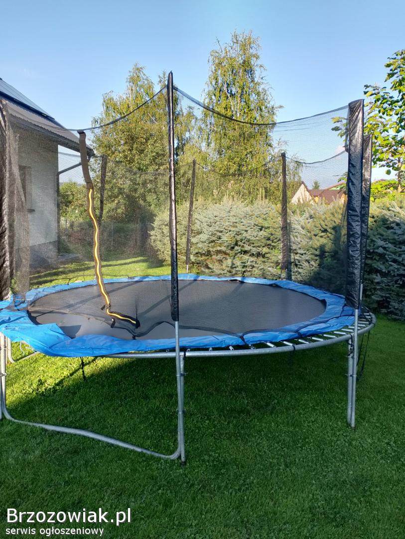 Sprzedam używaną trampolinę, duża, średnica 4 metry. Sprzęt ma 8 lat, jeszcze parę sezonów posłuży. W zeszłym roku wymieniona siatka i koło osłonowe. W batucie mały ubytek widoczny na zdjęciu. Cena 180 złotych. Odbiór osobisty w Dukli. Demontaż do transportu we własnym zakresie