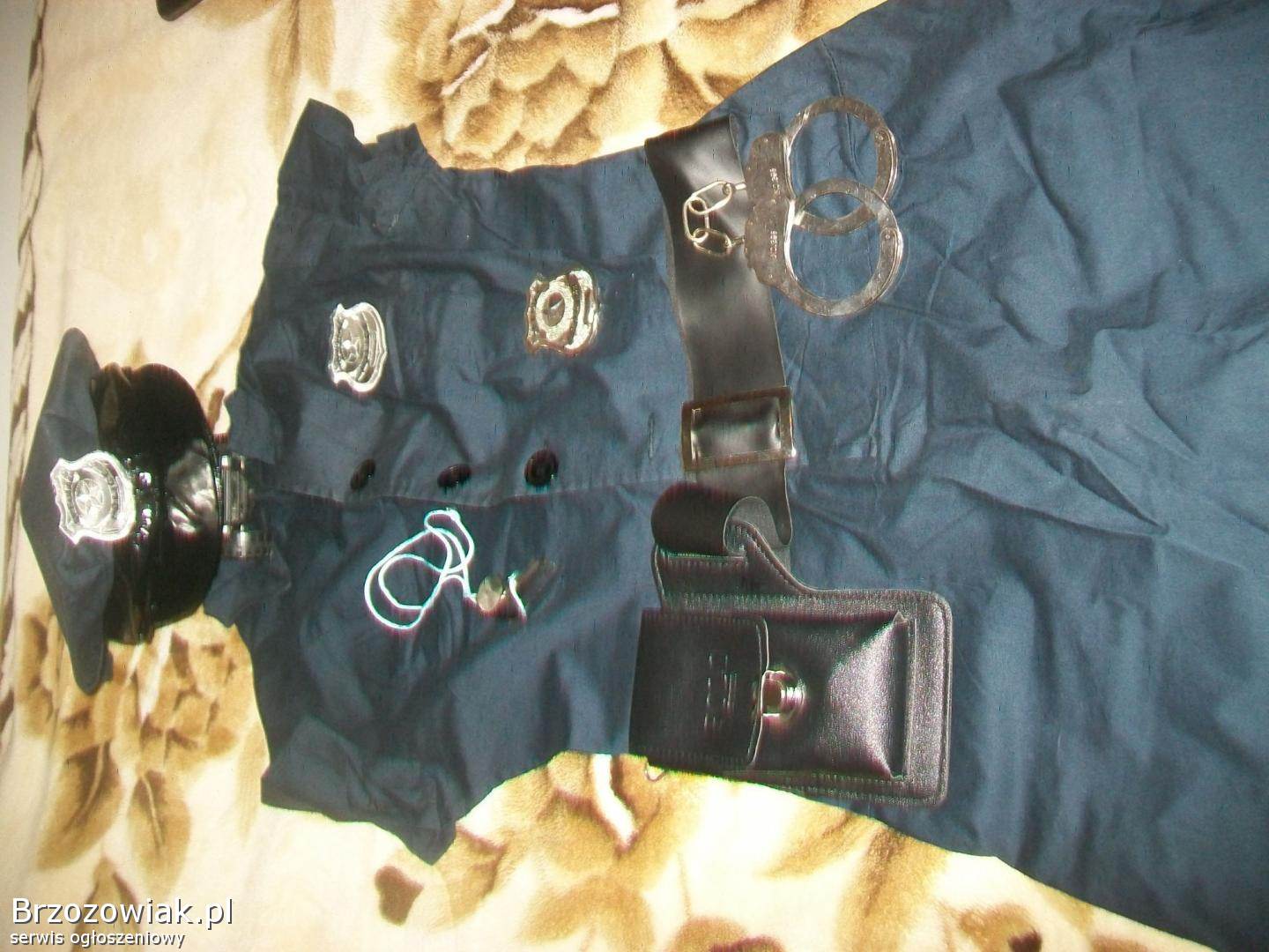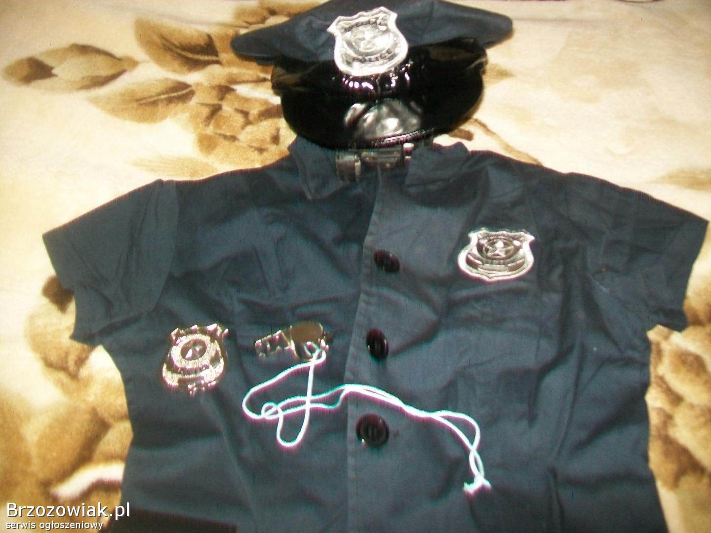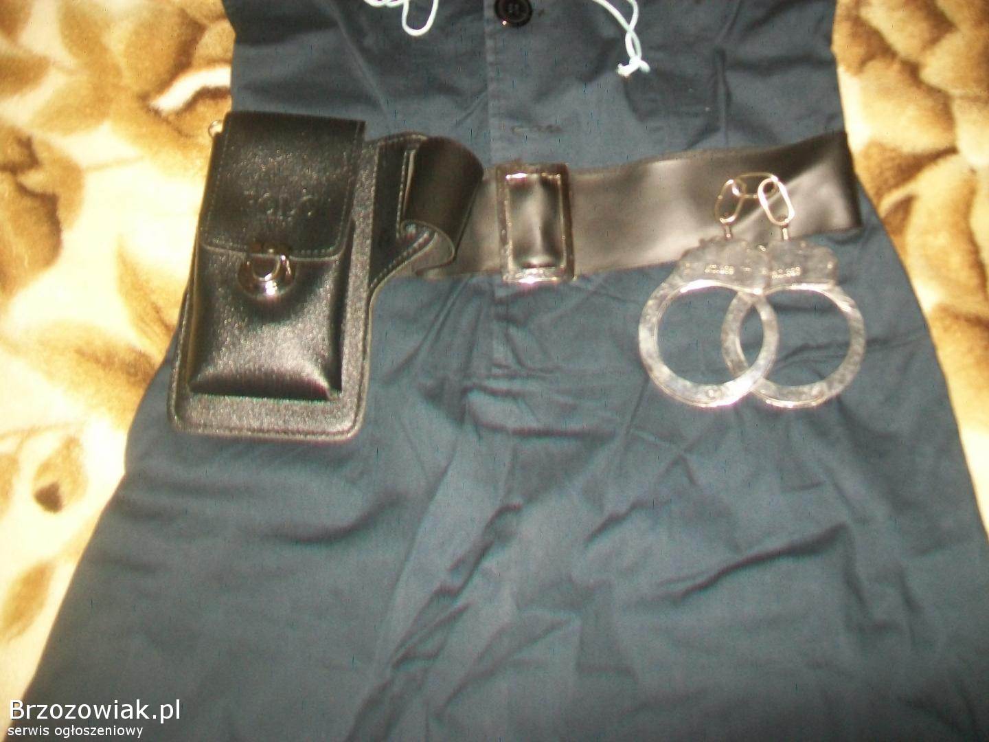 Sprzedam, widoczny na zdjęciach ubiór policjantki dla dziewczynki, spódniczka wys. 82 cm. szer. w pasie 35 cm. czapka, kajdanki z futerałem i paskiem, metalowa odznaka gwizdek, cena za wszystko. ,