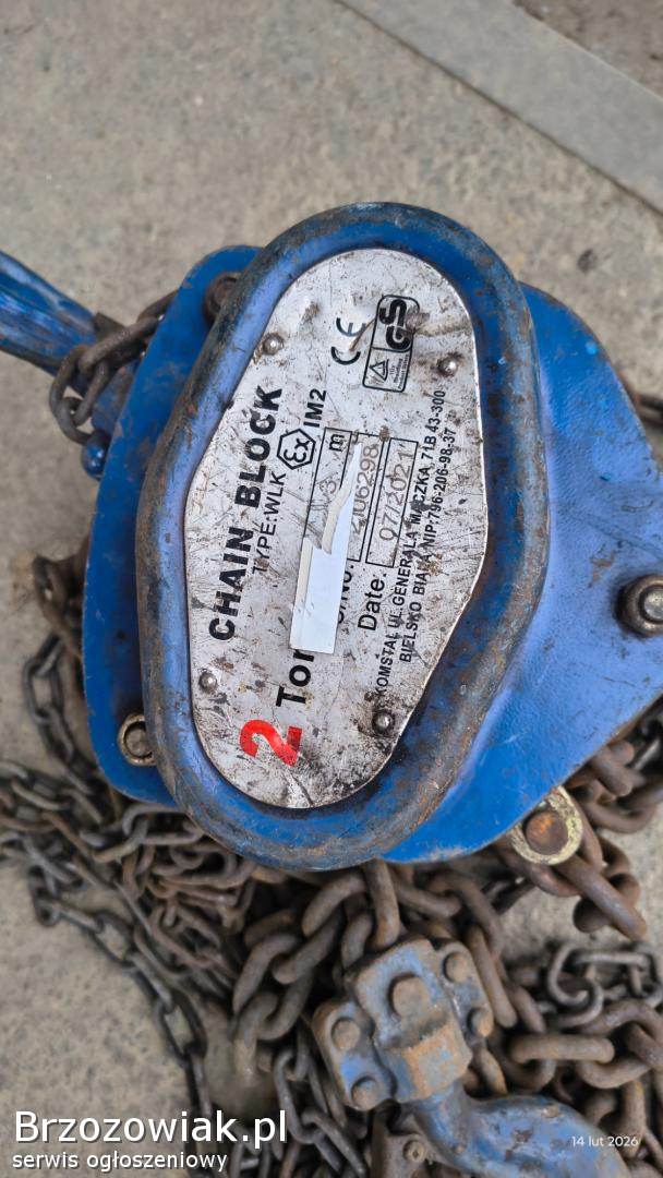 Ręczna wciągarka łańcuchowa o udźwigu 2 tony i długości łańcucha 3 metry. Urządzenie jest używane, ale w dobrym stanie technicznym. Świetnie nadaje się do zastosowań w warsztacie lub na budowie.
