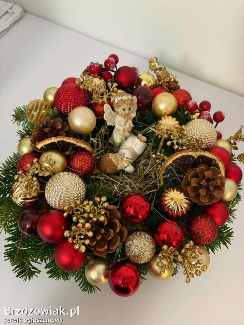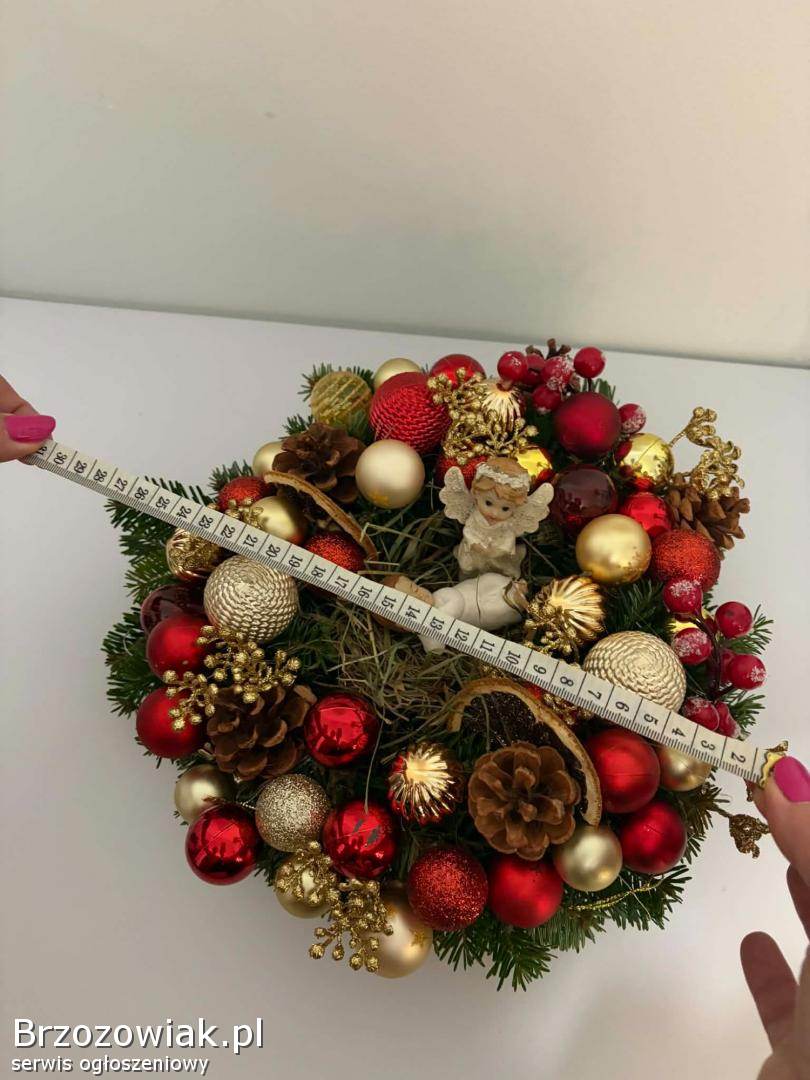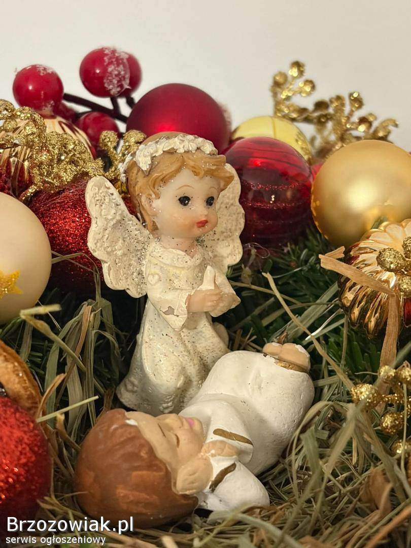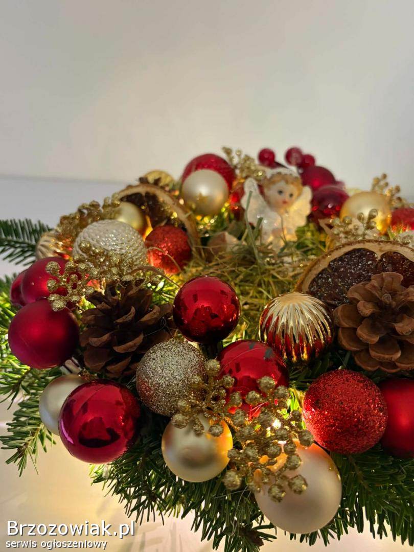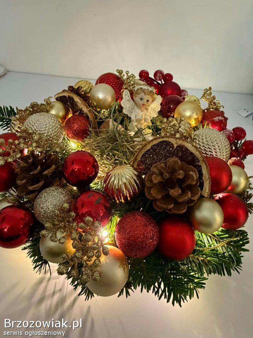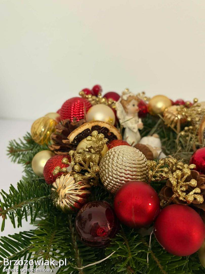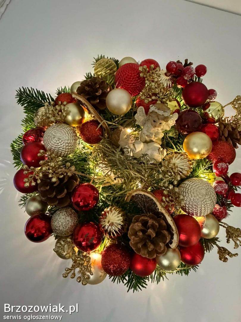 Sprzedam wianek bożonarodzeniowy na stół i wymiarach podanych na zdjęciu. W kolorach złota i czerwieni, zrobiony na gorącym kleju. Posiada światełka widoczne na zdjęciu( baterie paluszki grube).