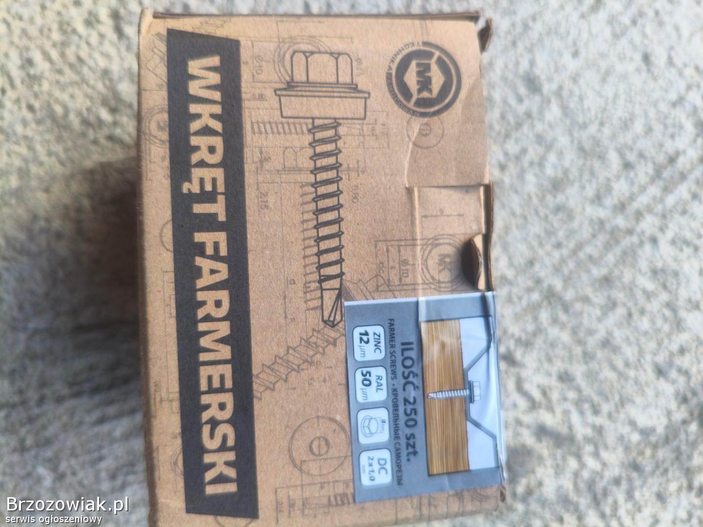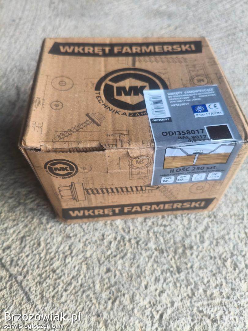 Sprzedam wkręty farmerskie w kolorze brązowym 8017. 250 sztuk w oryginalnym opakowaniu nie otwierane, zostało po budowie.