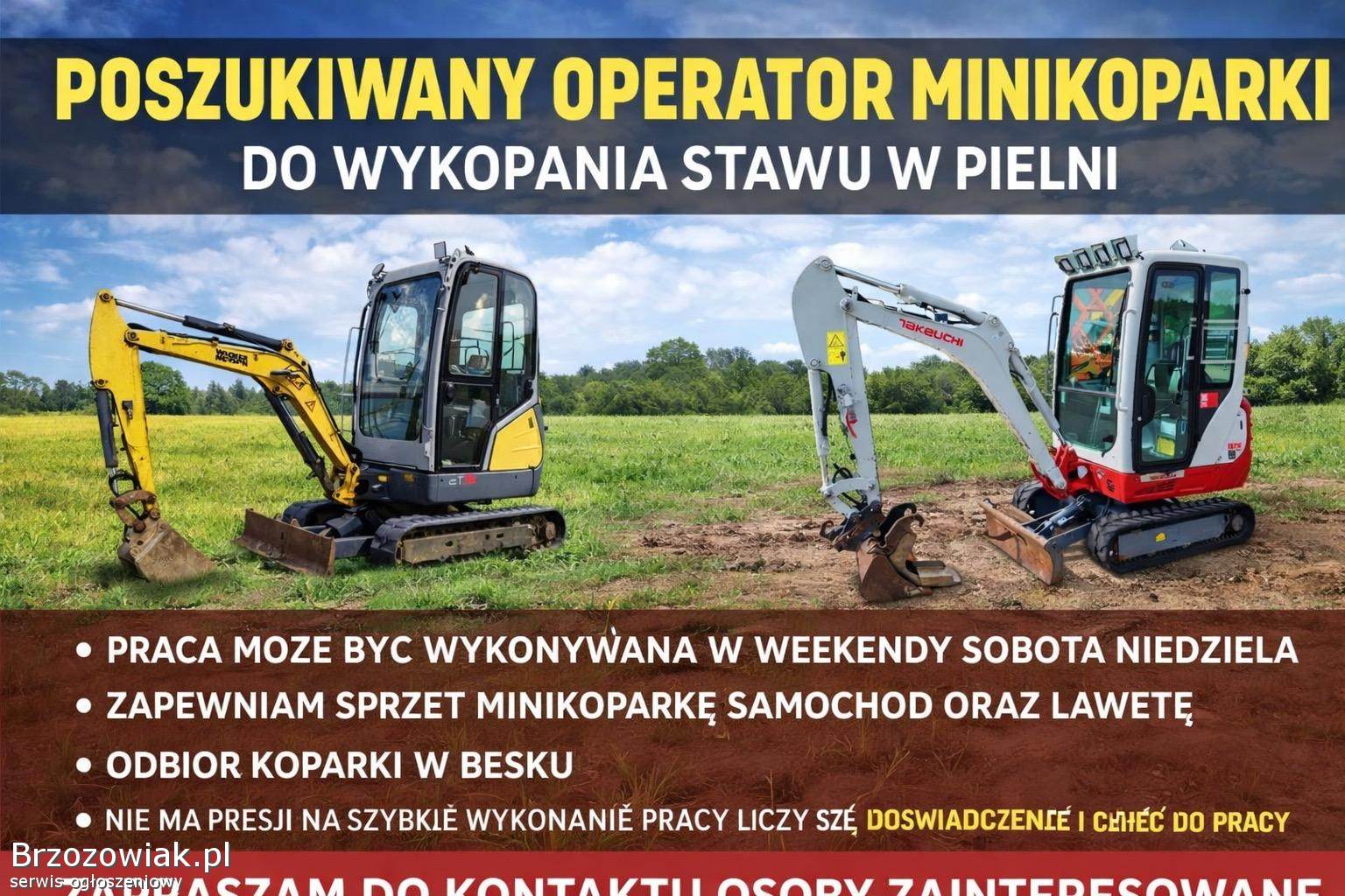 Poszukuje operatora minikoparki do wykonania wykopu pod staw w miejscowosci Pielnia
