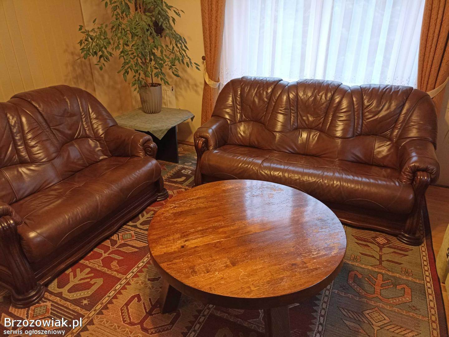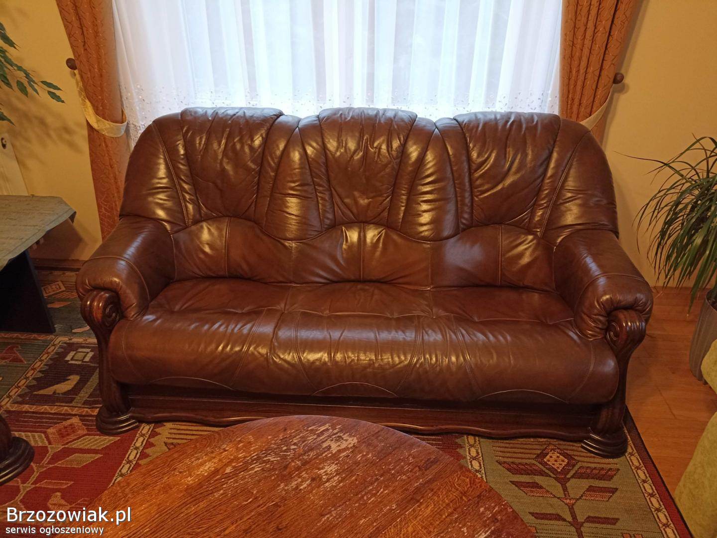 Sprzedam zestaw eleganckich skórzanych sof w kolorze brązowym. W skład kompletu wchodzą: