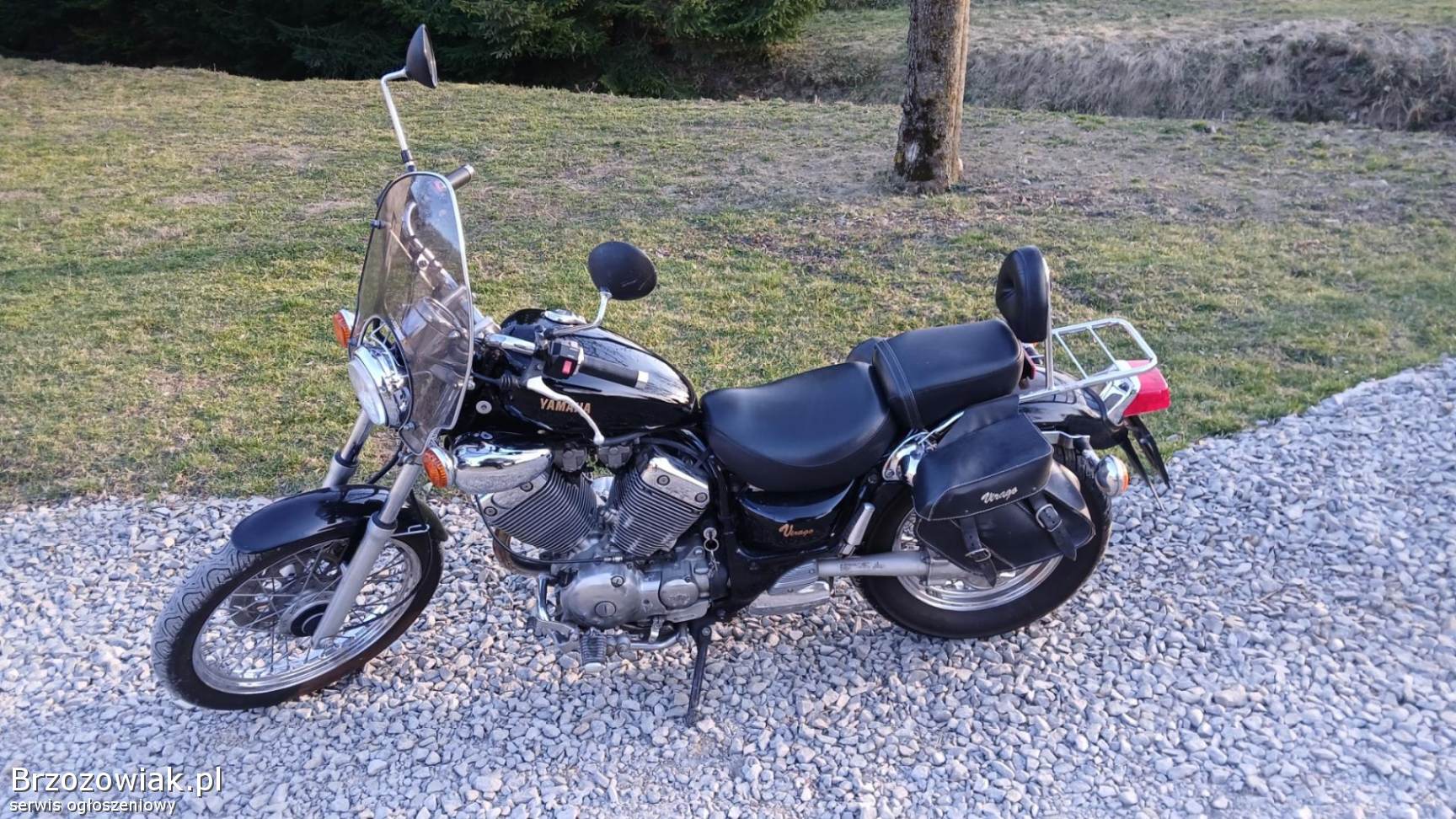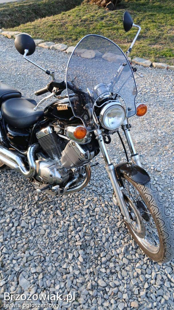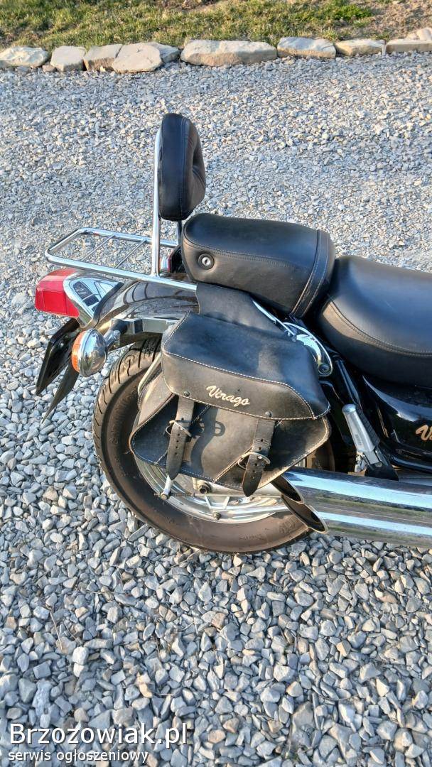 Sprzedam Yamaha Virago 535 z 1994 roku, w bardzo pięknym stanie. Posiada owiewkę, lusterka, bagażnik i sakwy. Motocykl jest sprowadzony z Niemiec, kupiony od starszej pani, pierwszej właścicielki. Użytkowała go sporadycznie, serwisowała na bieżąco, jest cała książka ze wszystkimi naprawami w serwisie, za dość spore pieniądze. Jestem pierwszym właścicielem w Polsce, posiadam go 5 lat, przez ten czas regularnie go serwisowałem. Motocykl ma przebieg 28 618 kilometrów. Motocykl bardzo fajnie się prowadzi, wszystko działa bez zarzutu, jest gotowy do jazdy. Nigdy nie miał żadnego wypadku, oryginalny lakier, silnik bardzo równo pracuje. Sprzedam w dobre ręce.