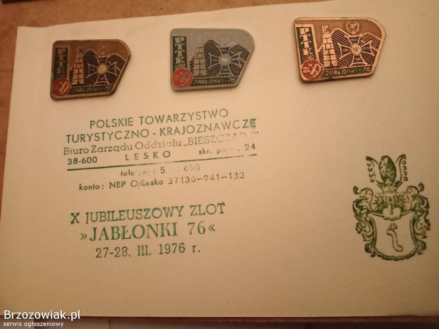 Zestaw 3-ch odznak x zlotu Jabłonki 76 org. przez PTTK Lesko wraz z okolicznościowym stemplem, odznaki na przykręcanie, całość wykonana w metalu.