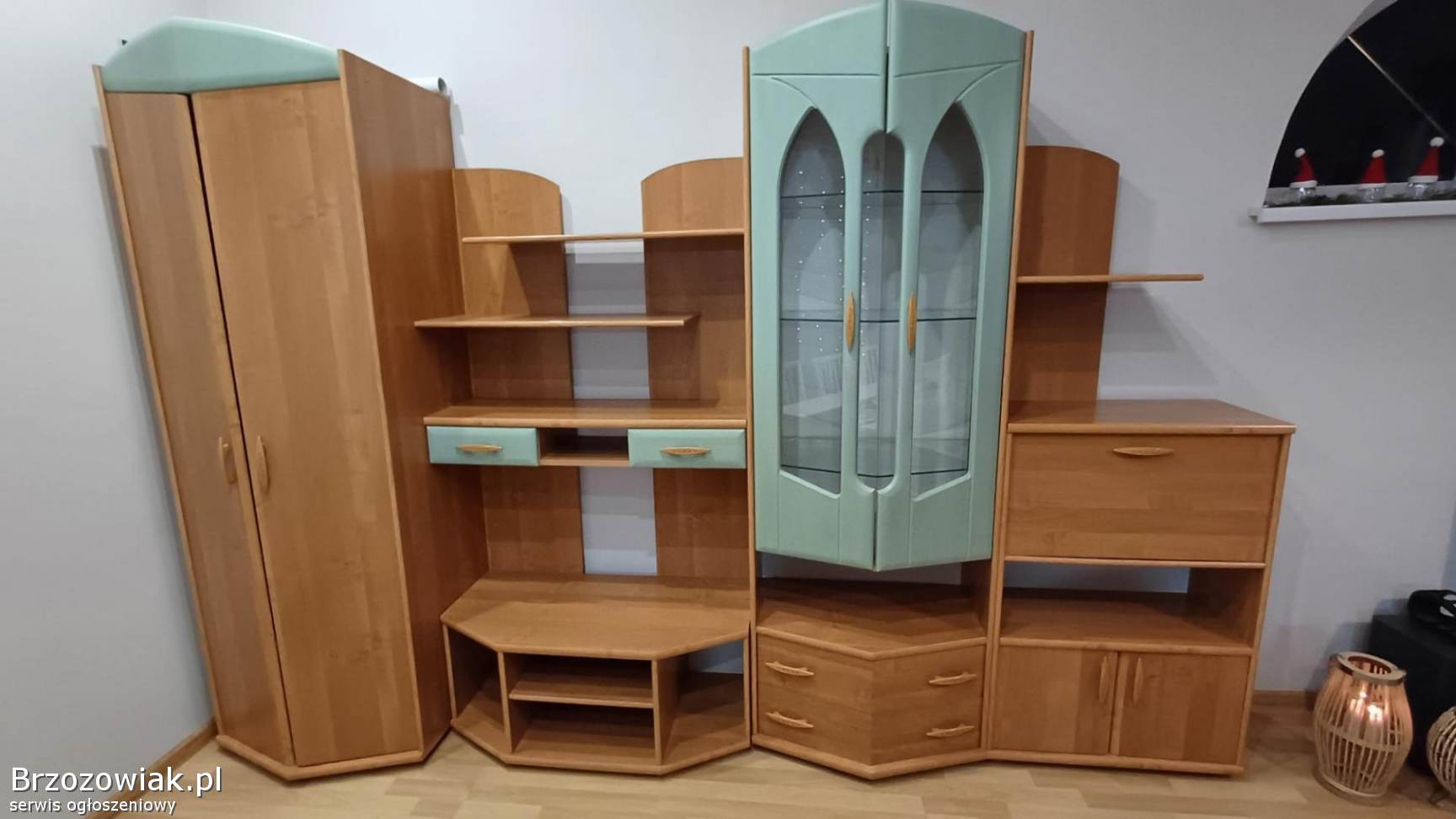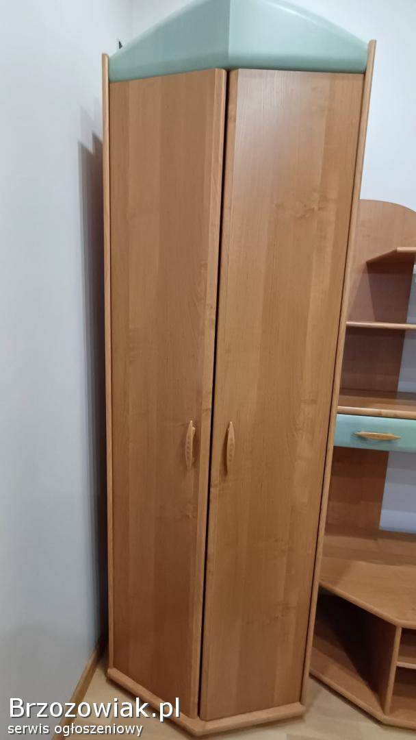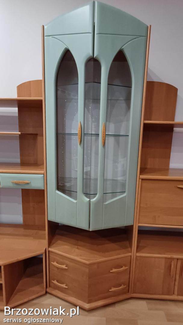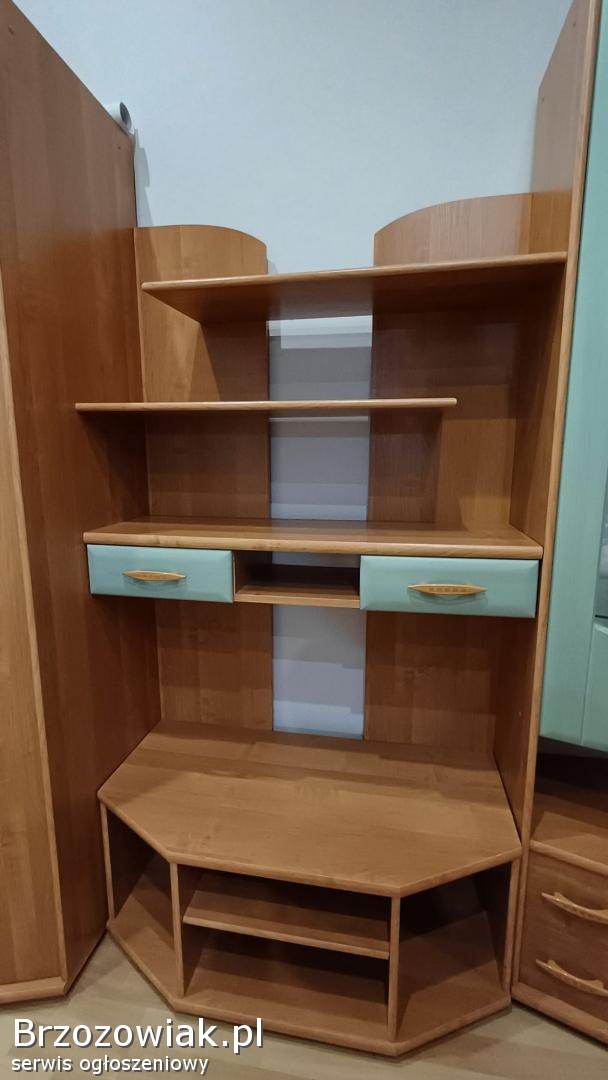 Sprzedam kompletny, funkcjonalny zestaw mebli modułowych w bardzo dobrym stanie, idealny do urządzenia salonu, pokoju dziennego lub sypialni. Meble wykonane są z solidnej płyty laminowanej w kolorze jasnej olchy z charakterystycznymi, miętowo-zielonymi akcentami (blaty i fronty szuflad/witryny).