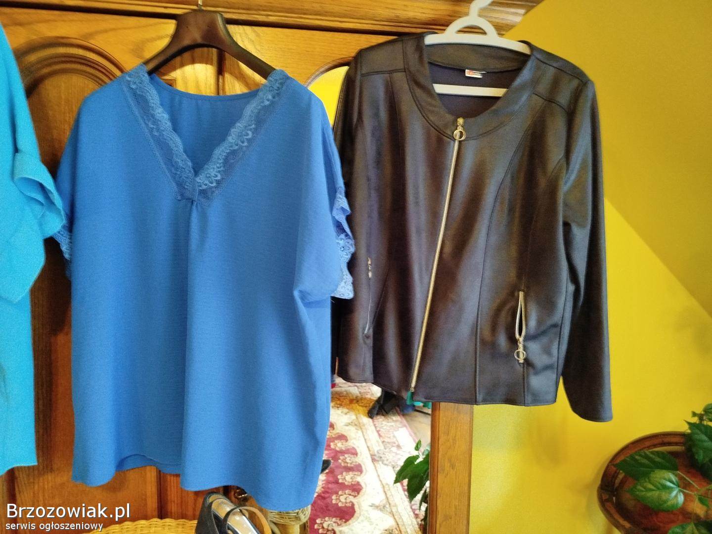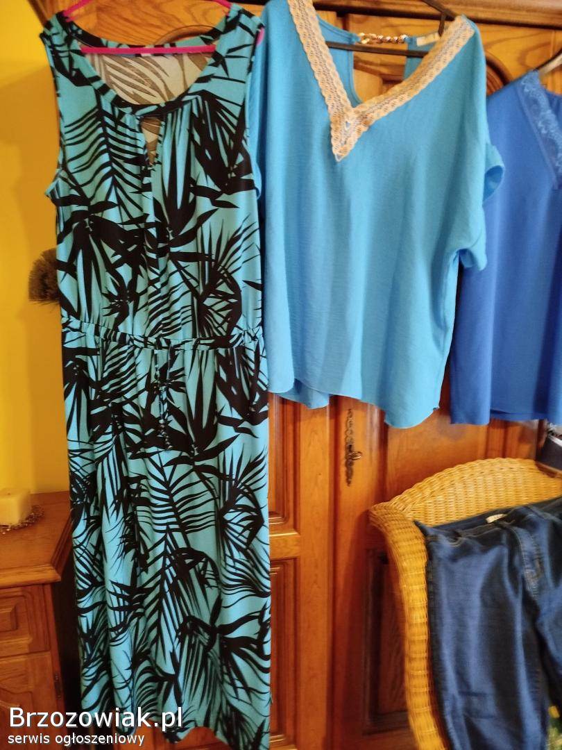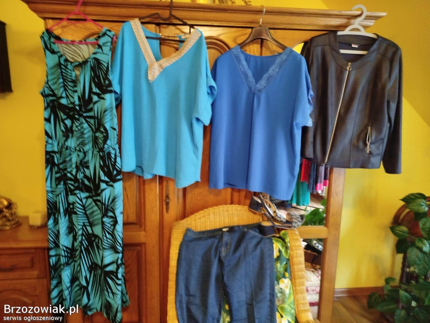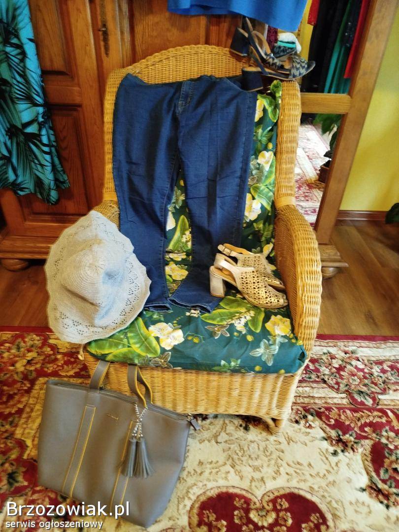 Zestaw składa się z jeansów 46 - 48 elastyczne, sukienki niebieskiej we wzory, bluzki, żakieciku na zamek, sandałki 39 granatowe, wysokie czółenka skórzane ażurowe 39 i kapelusza, cena do negocjacji